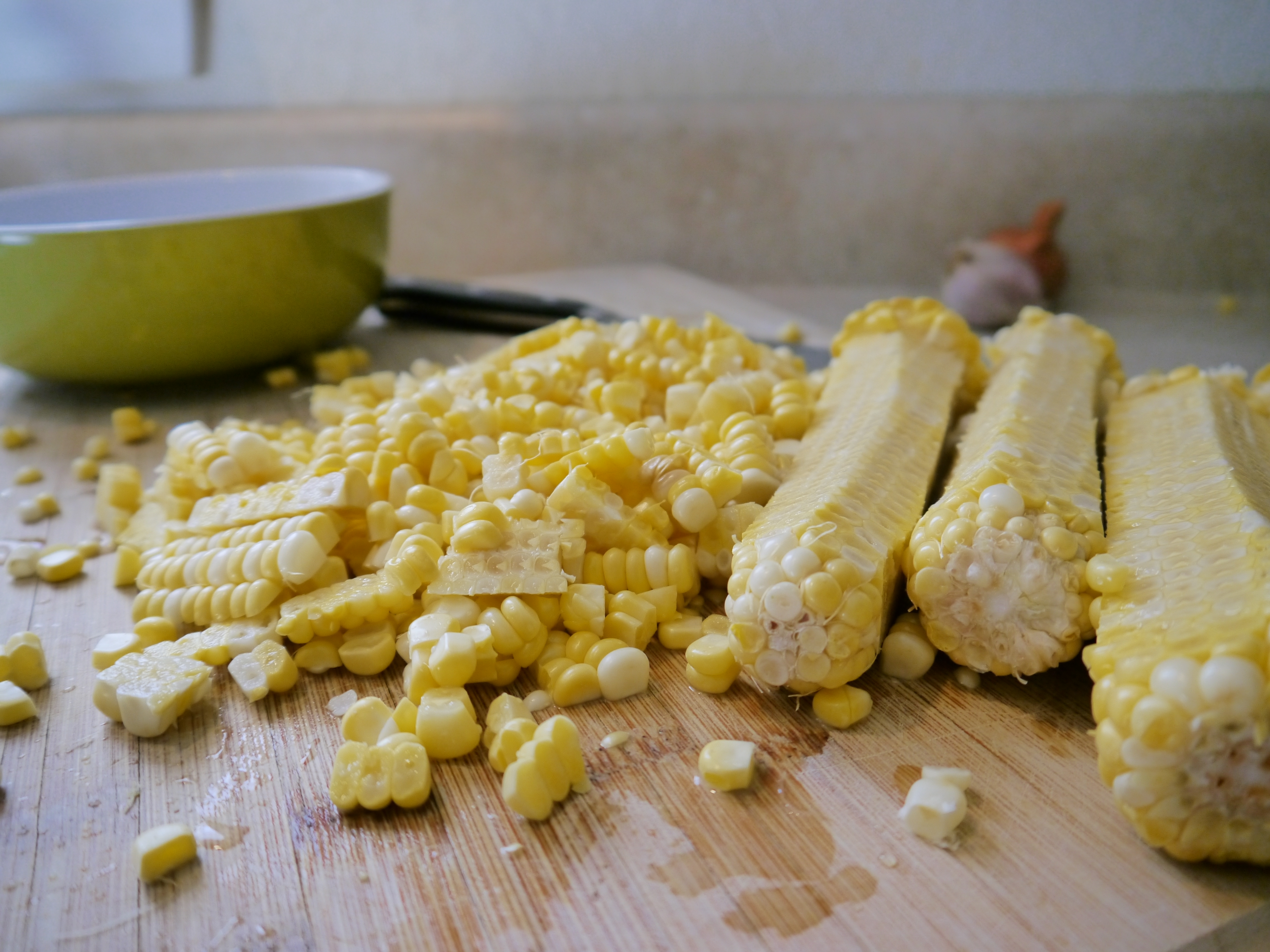 Start by removing the corn from the cob and gathering the rest of your ingredients.  Warm the stock over low heat – keep it on the back burner during this entire process.  When making risotto, you ONLY add hot stock to the pot… never room temperature or cold.  Make sure all your ingredients are on-hand and ready to go!