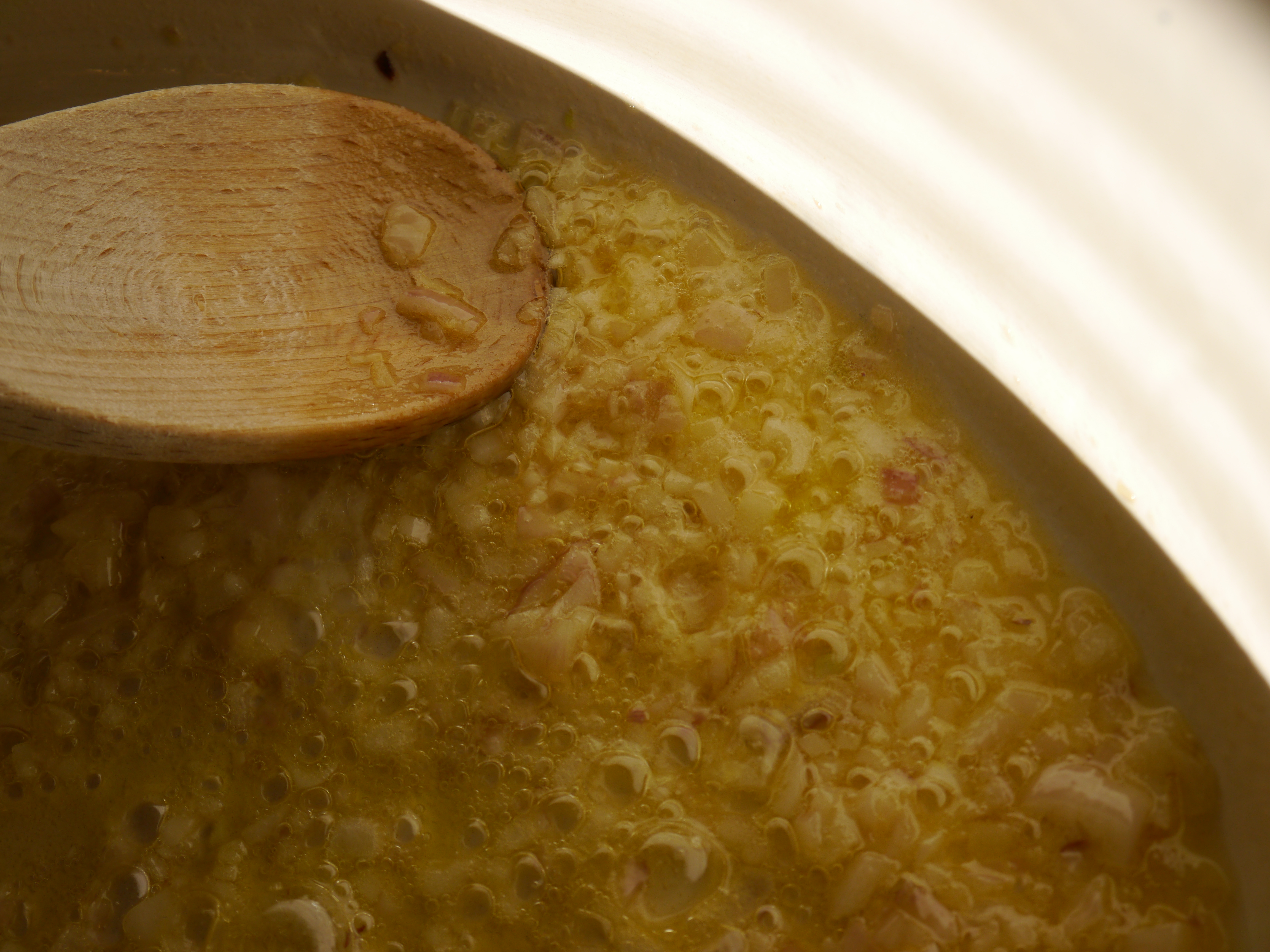 Heat the butter and olive oil in a very heavy-bottom pot over medium heat (my preferred vessel for risotto is ALWAYS the Dutch Oven).  Add the shallot and cook until clear, but not browned.