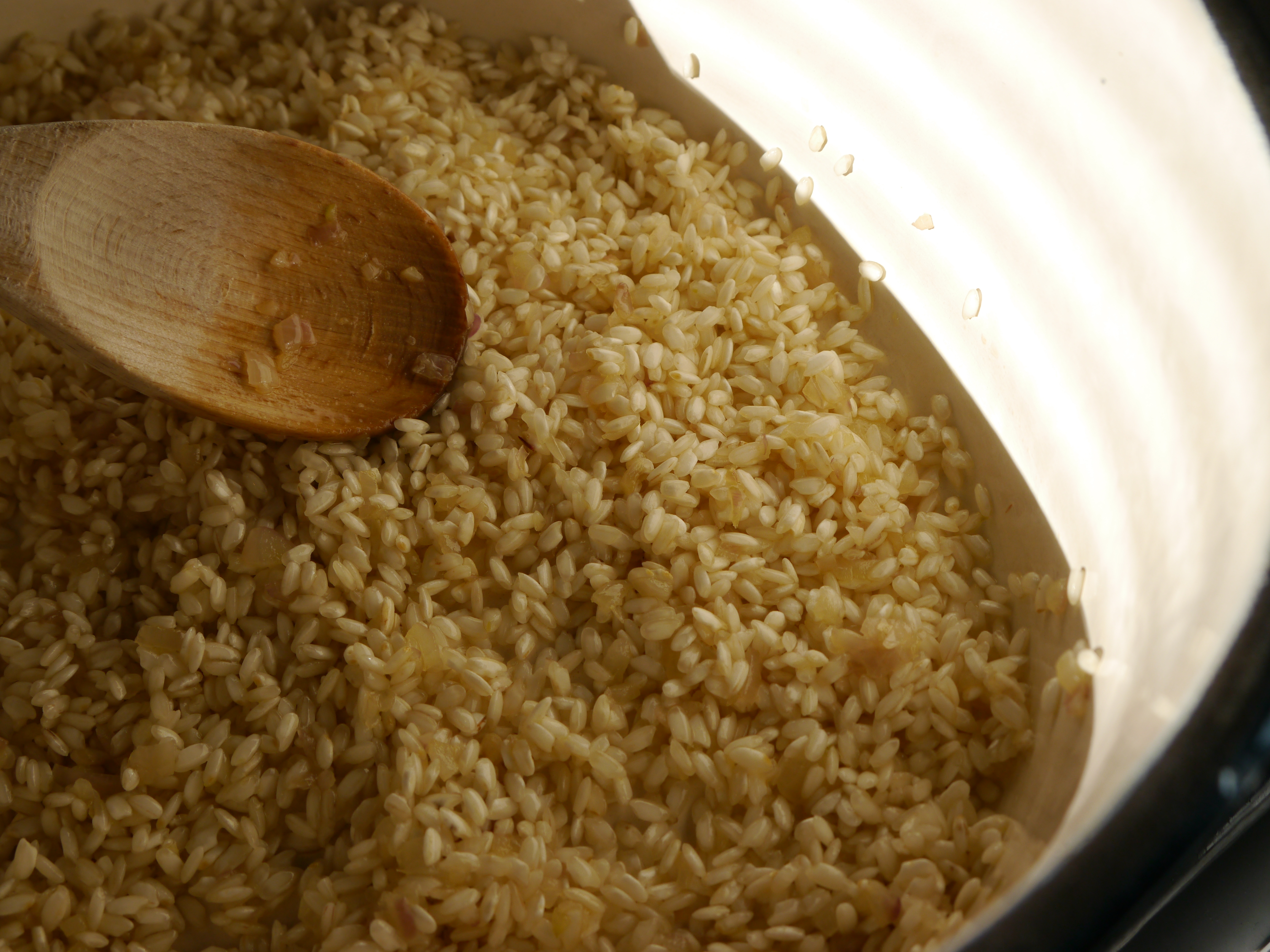 Add the rice and continue to cook (stirring the entire time) for around 2 minutes.  Add the wine (stand back because this will produce a lot of steam).  Stir until the wine has been absorbed by the rice.  Add the garlic and stir before adding your first cup of stock to the mix.