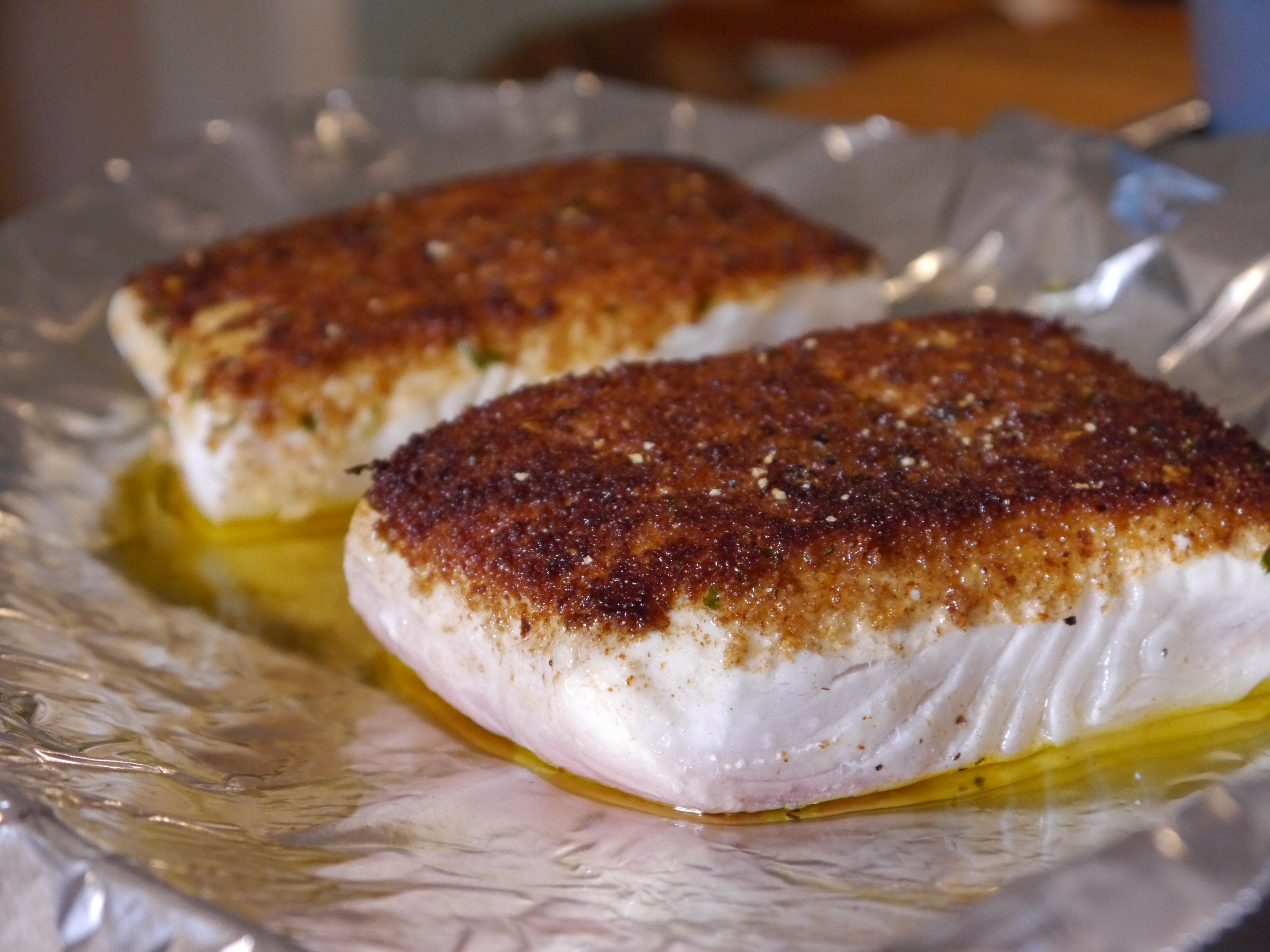 Carefully place the fish, crumbs down, into the hot pan and DO NOT MOVE it.  Allow it to cook for a minute or two before gently lifting the edge to check for desired ‘brownness’.  Carefully remove the fish and place it onto a prepared baking sheet crumb side up.  Transfer it to the oven to allow it to finish cooking all the way through.  How long this takes will depend on the thickness of the fish you have.  Mine took about five minutes.