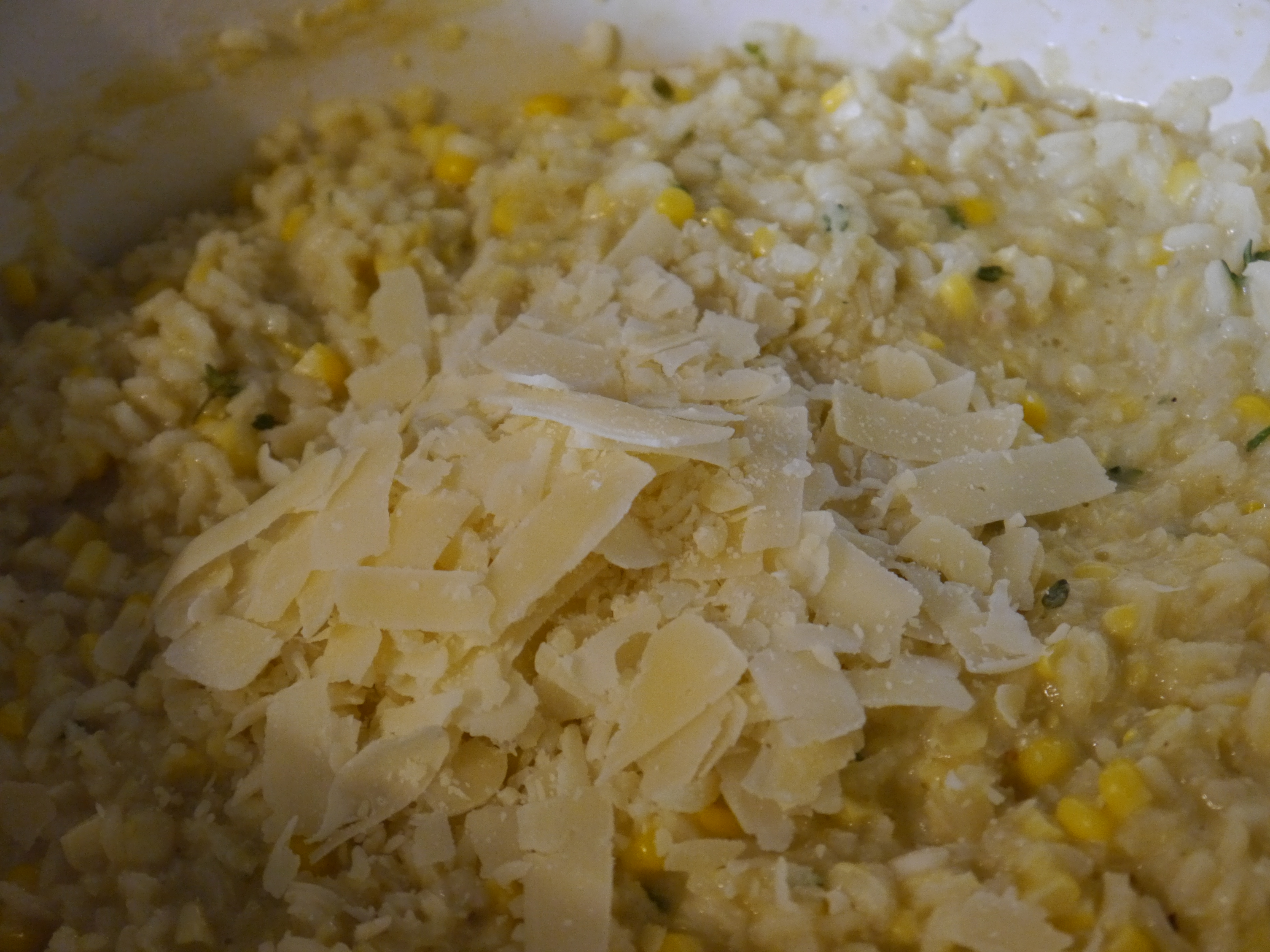 While the fish is finishing up, go back to the risotto.  When almost all the liquid has been absorbed and the rice is almost cooked through, add the corn.  Allow it to cook for a few minutes.  Add the blended corn and allow it to cook for a few more minutes.  Remove from heat and stir in the Parmesan cheese and any additional herbs you’re using.  Cover until you’re ready to serve it.
