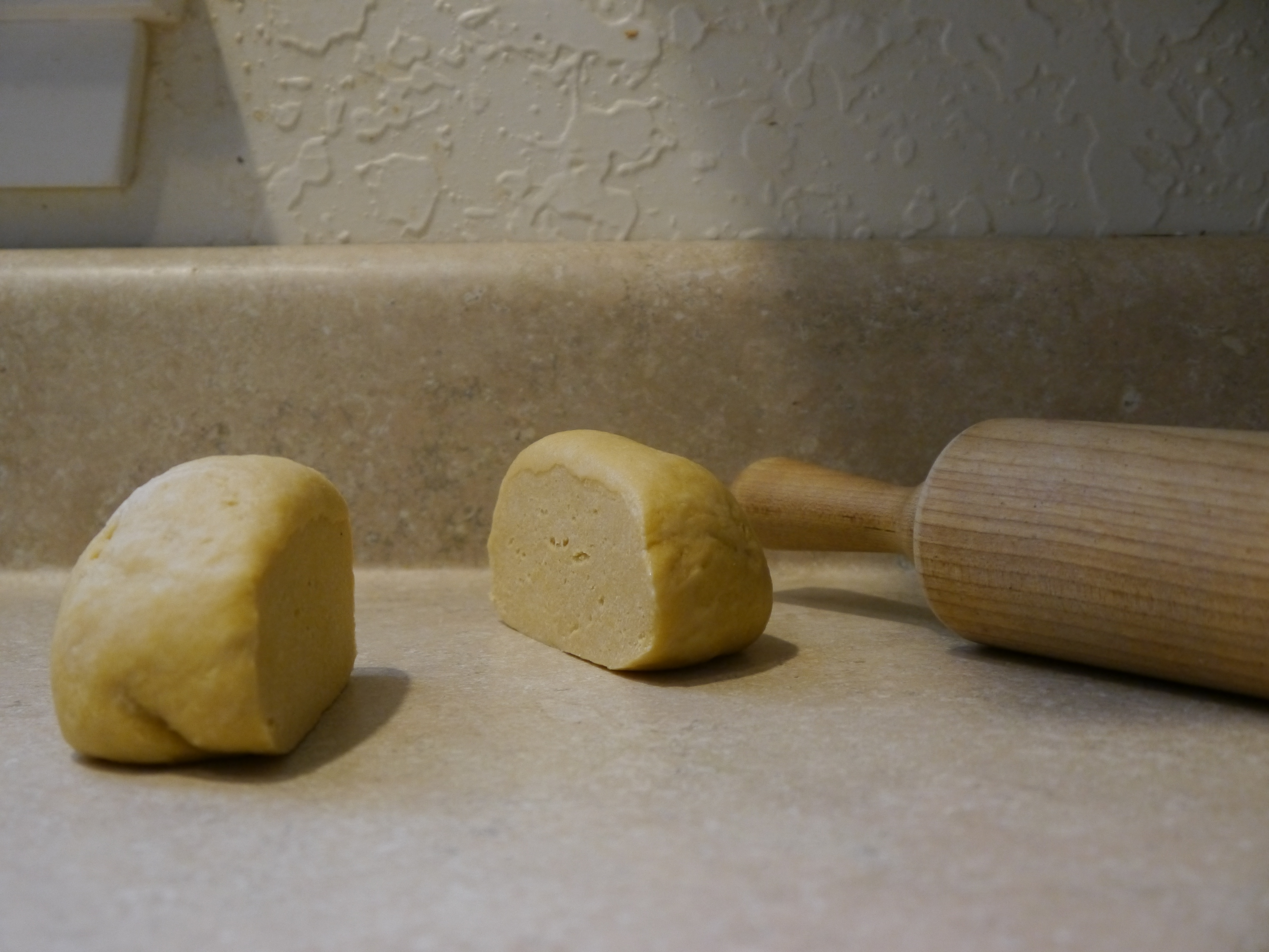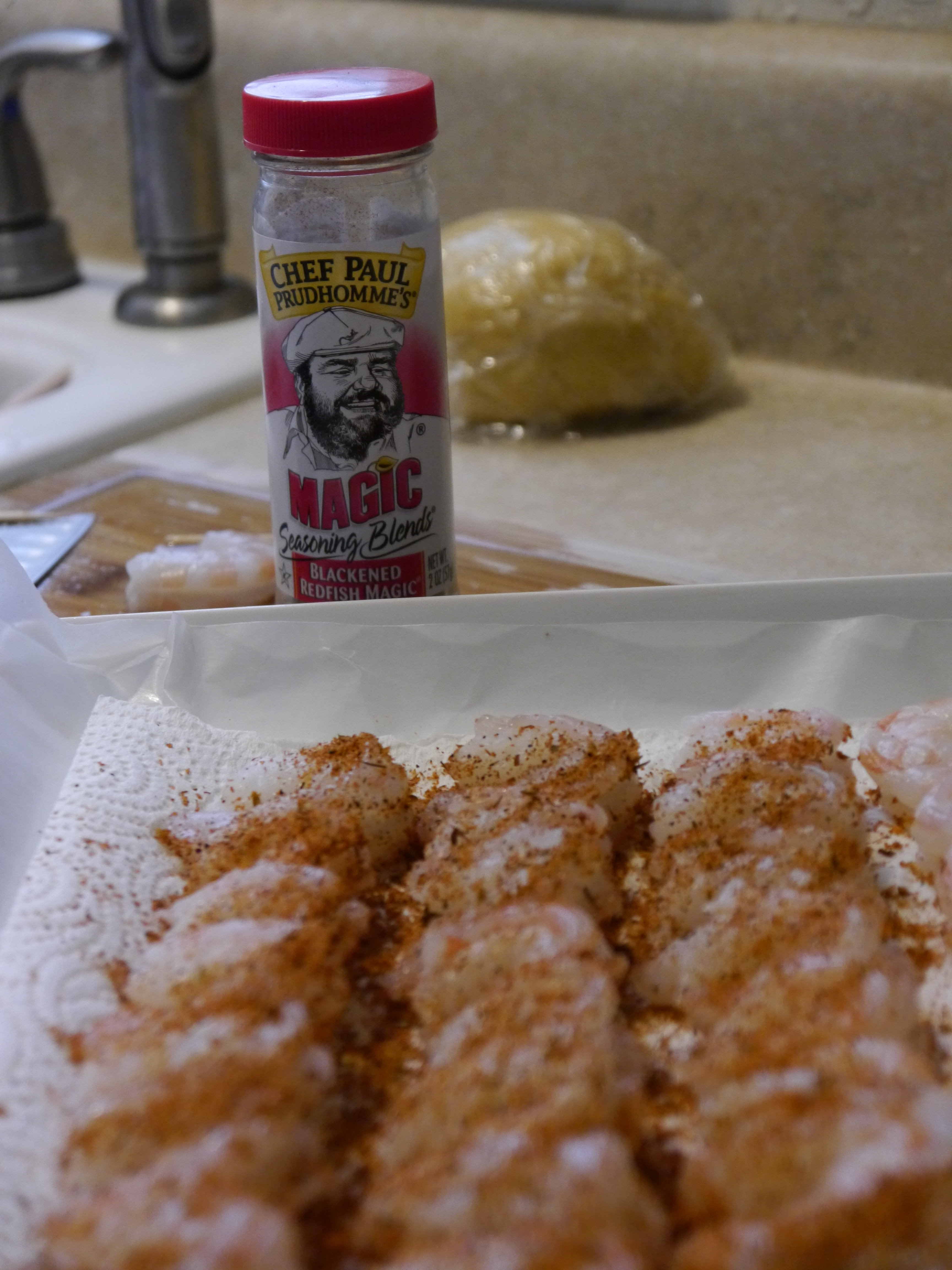 I turned it all out onto the counter and kneaded it by hand for about ten minutes. It doesn’t get elastic like yeast dough, but it gets smooth.  You can tell when it’s ready.  I covered it in plastic wrap and moved it to the back of the counter to rest for about a half hour while I tackled the shrimp.