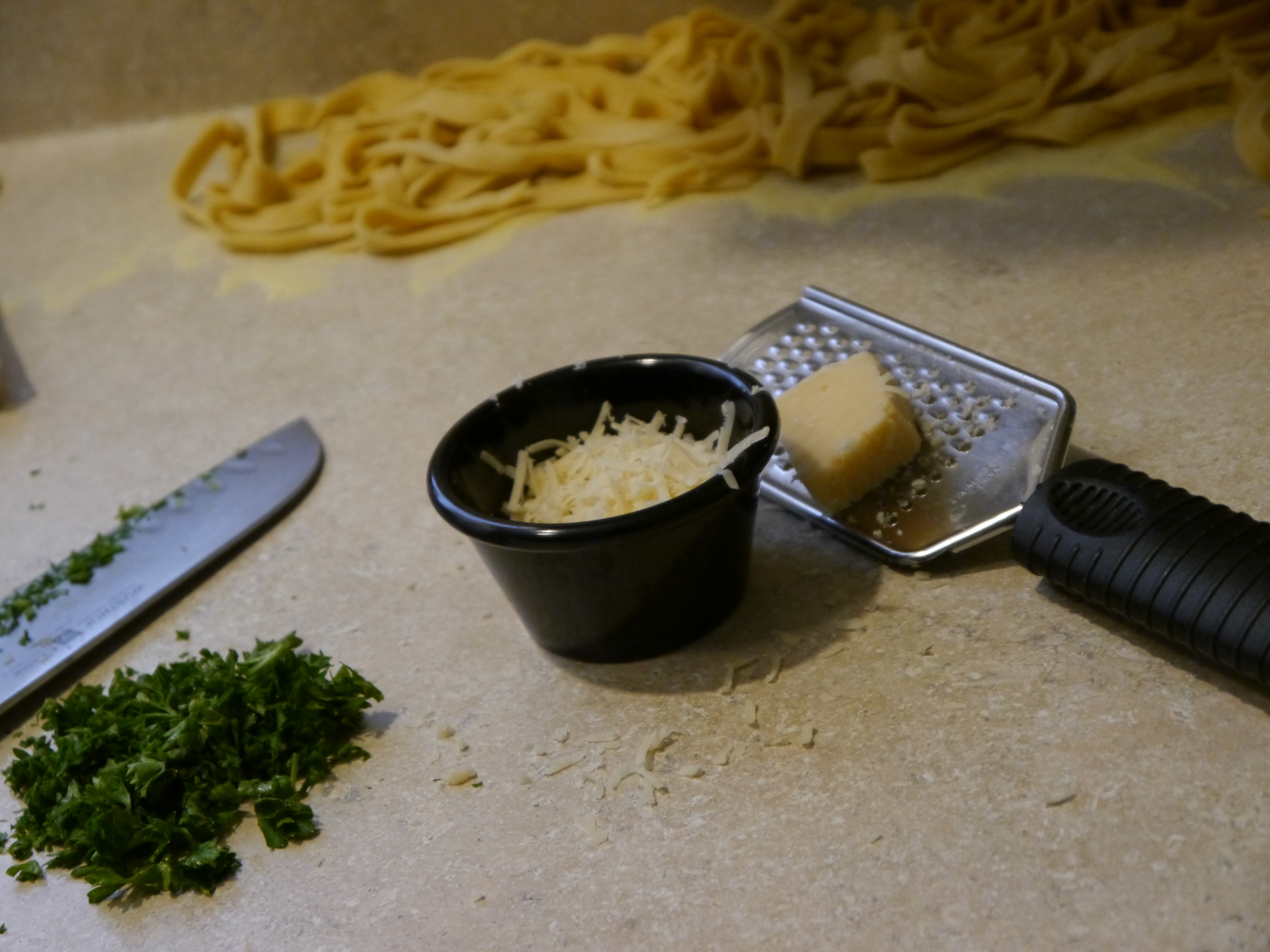 After I sliced them, I unrolled each strand and tossed it with additional Semolina flour.  I set the pasta strands toward the back of the counter and left them to dry out.  It takes at least ten minutes, but you can leave it until you finish whatever else you are doing.  It’s forgiving.  Cooking the pasta was pretty much the LAST thing I wanted to do since it takes under five minutes to cook.