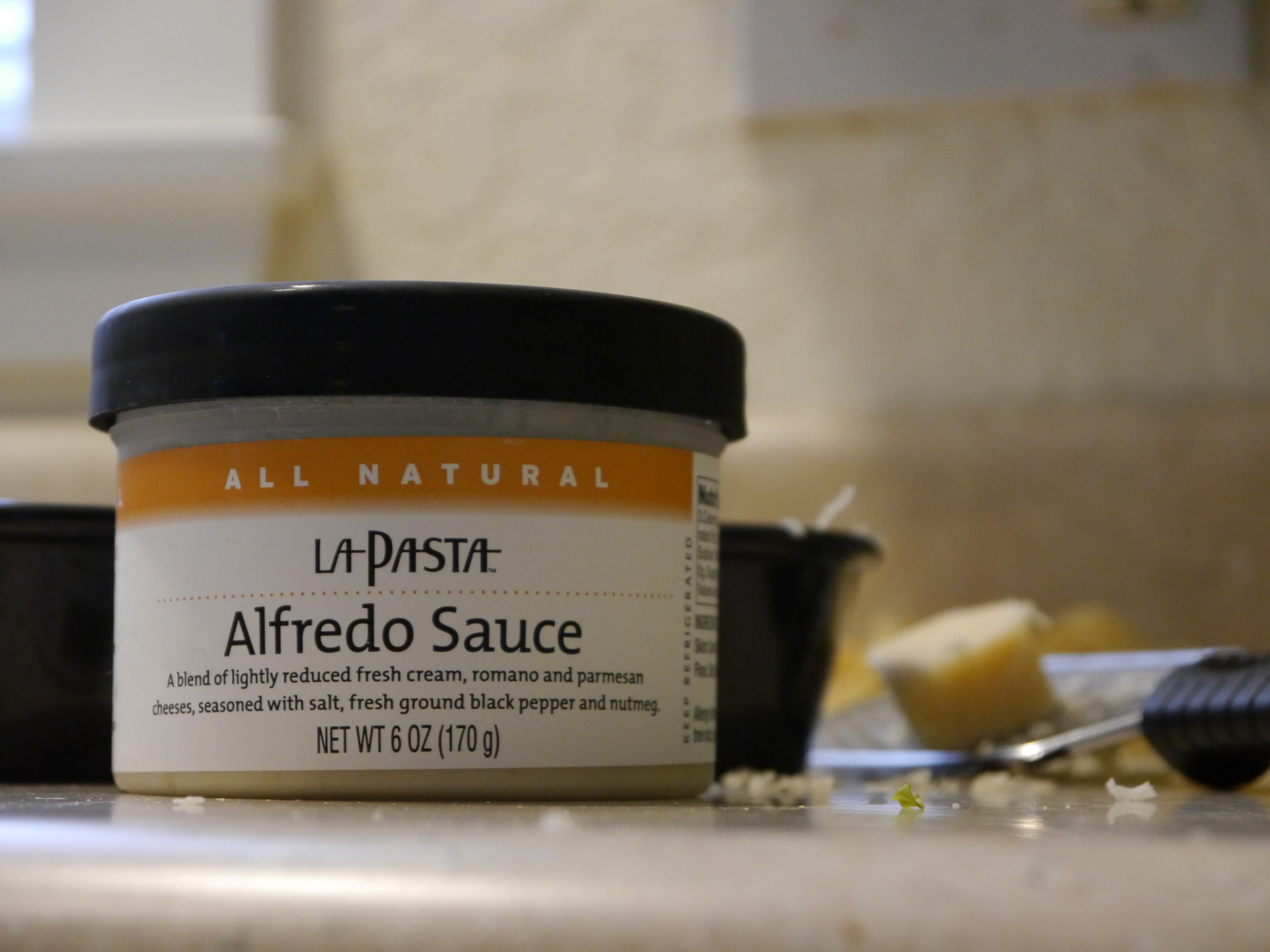 I prepared all my garnishes and heated the sauce.  The whole inspiration for this meal was a new product we have from a company called La Pasta.  They make delicious refrigerated pasta sauces.  They are all natural and so tasty.  I heated it in a saucepan over low heat.  I will warn you that it DID take quite a bit of whisking to reincorporate it all together but once it was warm, it came together all at once.  I would not recommend doing this in the harsh heat of a microwave.  It might break the sauce.  I chopped some parsley and grated some Parmesan cheese.