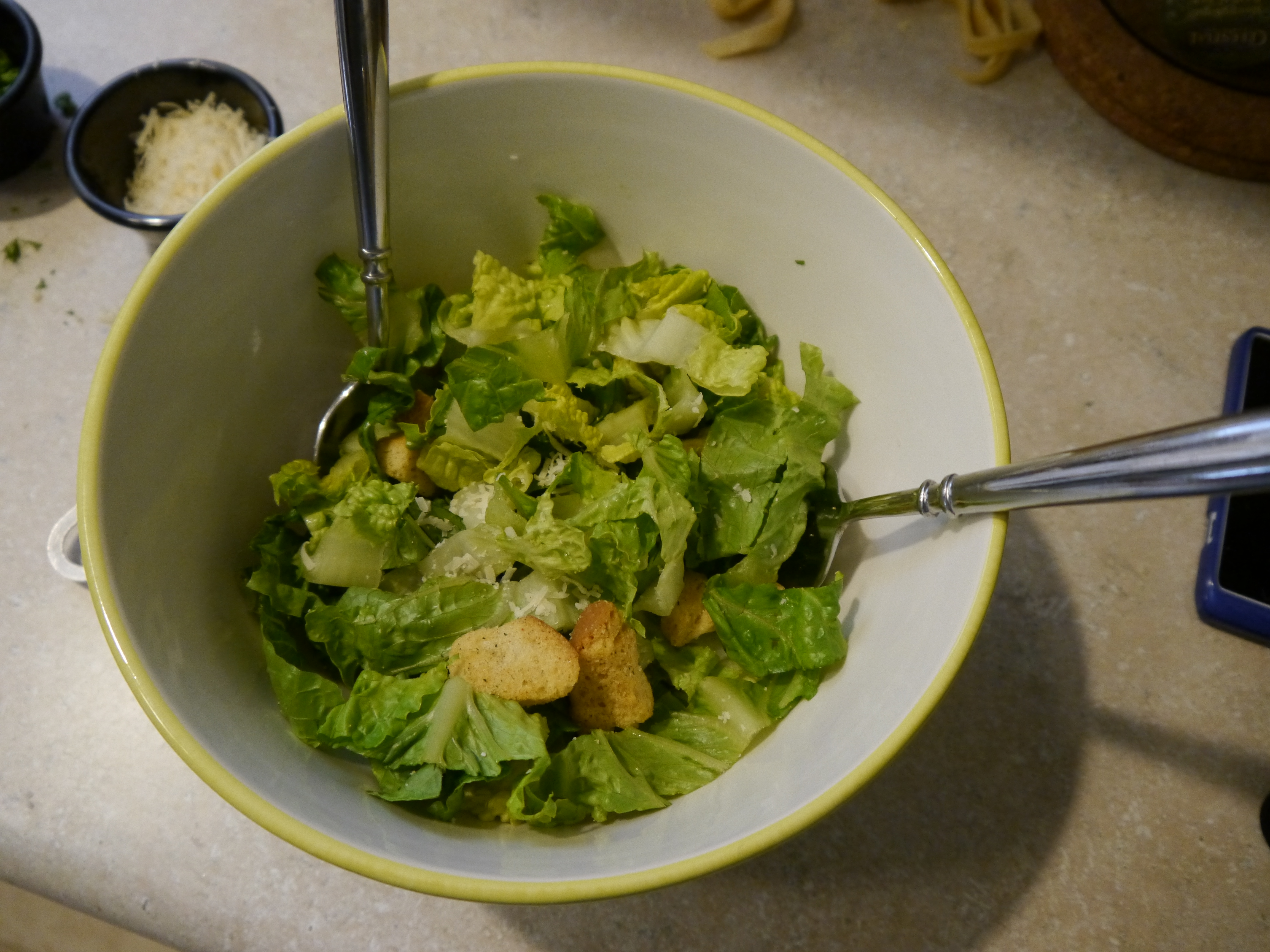 I brought a big pot of salted water to a rolling boil.  I boiled my pasta for just under five minutes (this is a good time to assemble a salad – I made a simple Caesar salad) and immediately drained it and returned it to the pot, where I combined it with the heated Alfredo sauce.