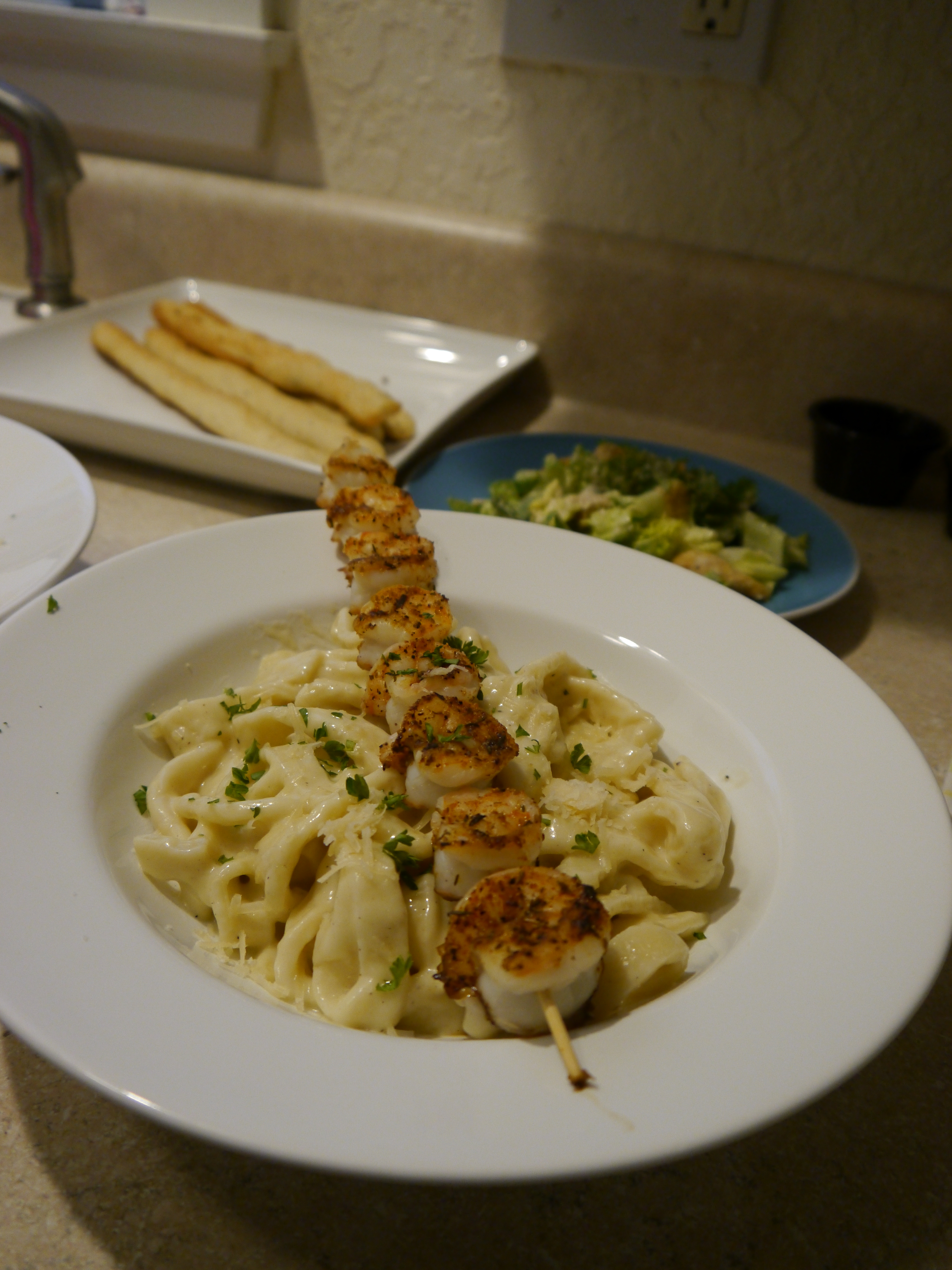 All that was left to do was assemble the meal!  Pasta and sauce in the bottom… shrimp on top!  I prefer to leave them on the skewer just for the sake of presentation.  I garnished each bowl with fresh parsley and Parmesan cheese and served it with the salad and the warm breadsticks.  Delicious restaurant-quality meal at home for four people for around $30!   My thoughts on the sauce:  this was by far the best prepared Alfredo sauce I have ever had.  My husband commented that he would never have believed it was not homemade.  It was not overly salty and it was so thick and creamy!  And then came the food coma.