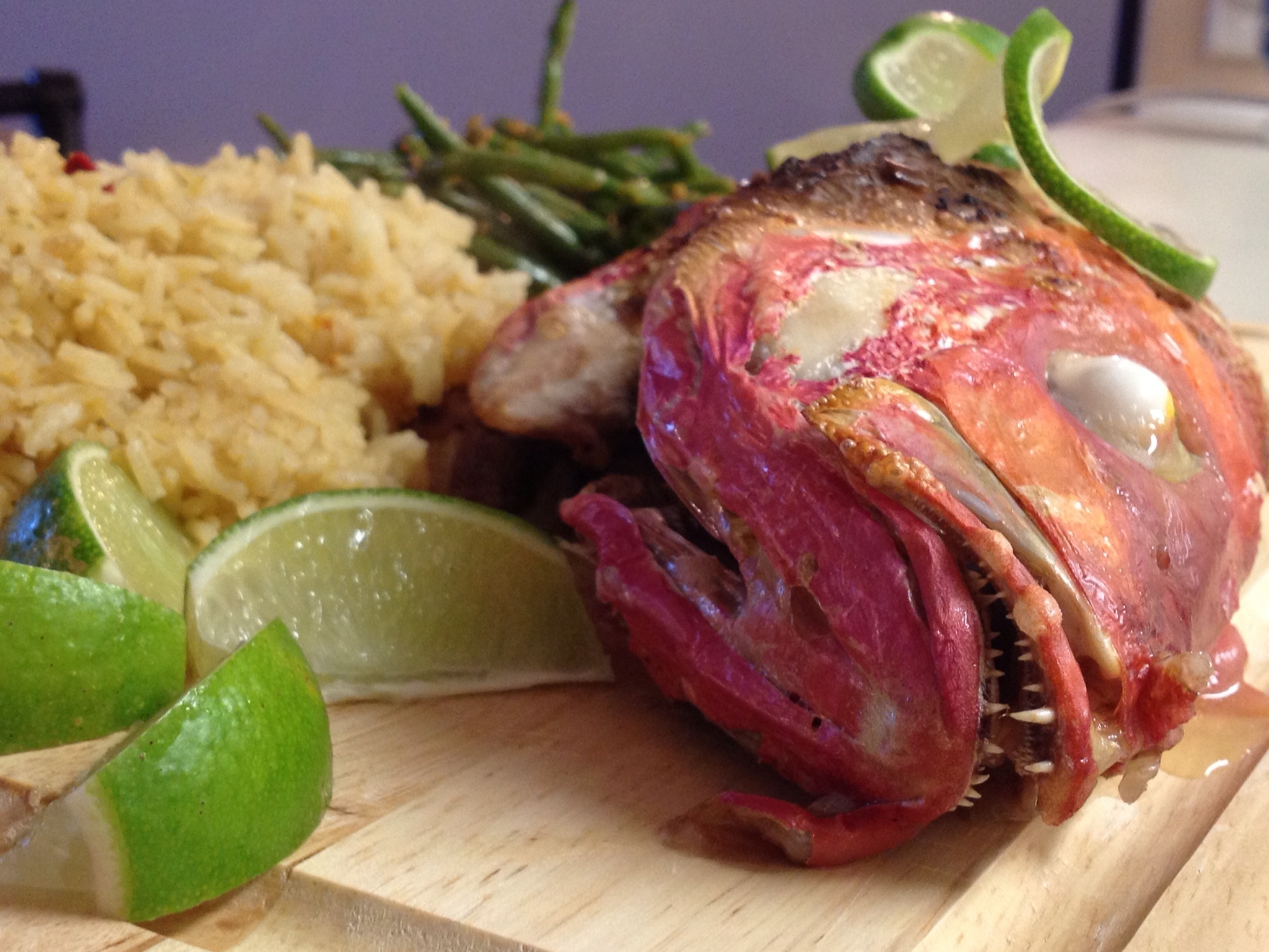 Start with one snapper around the two pound range and have it scaled, gutted, gilled and scored. Next I mixed a little fish tikka masala powder with a little olive oil so that it would spread over the fish well yet not overpower the delicate flavor of the fish. The snapper then went into a 350 degree oven for about 20-25 minutes. I also look for the lens to pop out of the eye (its almost like a built in timer!) The last couple minutes of cooking I like to turn on the broiler to get the skin nice and crispy! Garnish the fish with limes, add your sides and your ready to dig in!