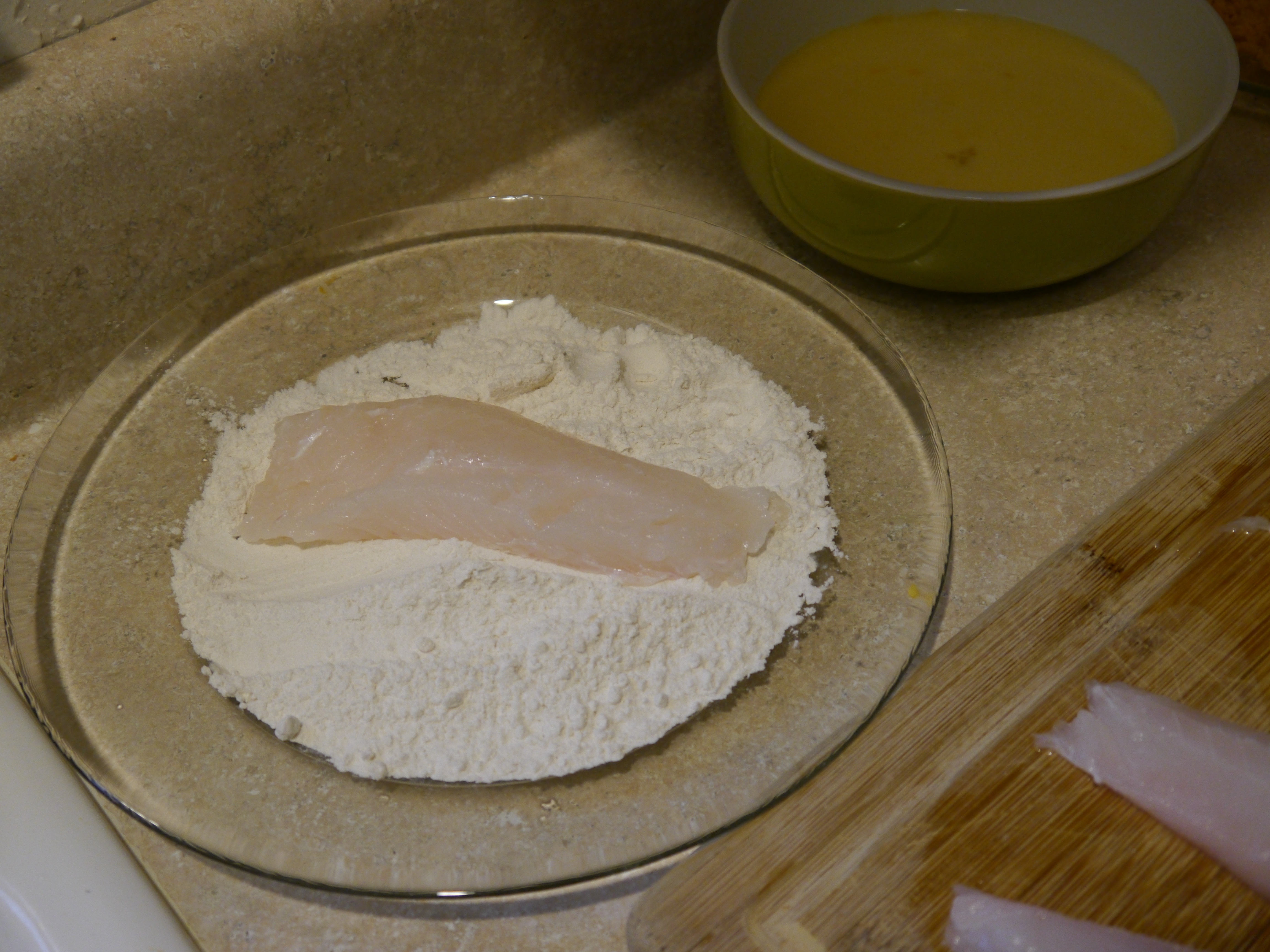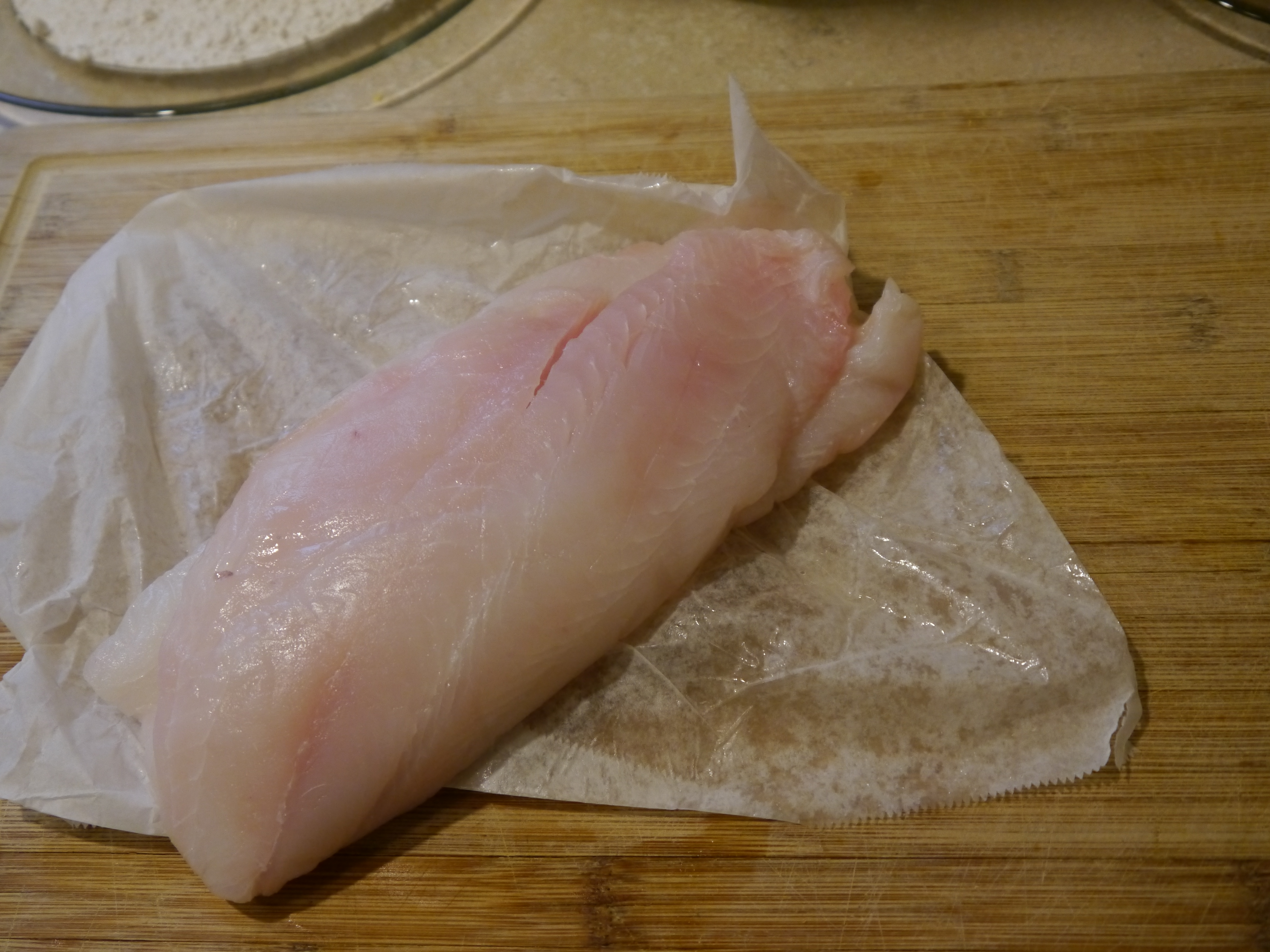First, it went into the flour.  Then the egg wash.  Then the cereal.   I set the coated fish on wax paper.