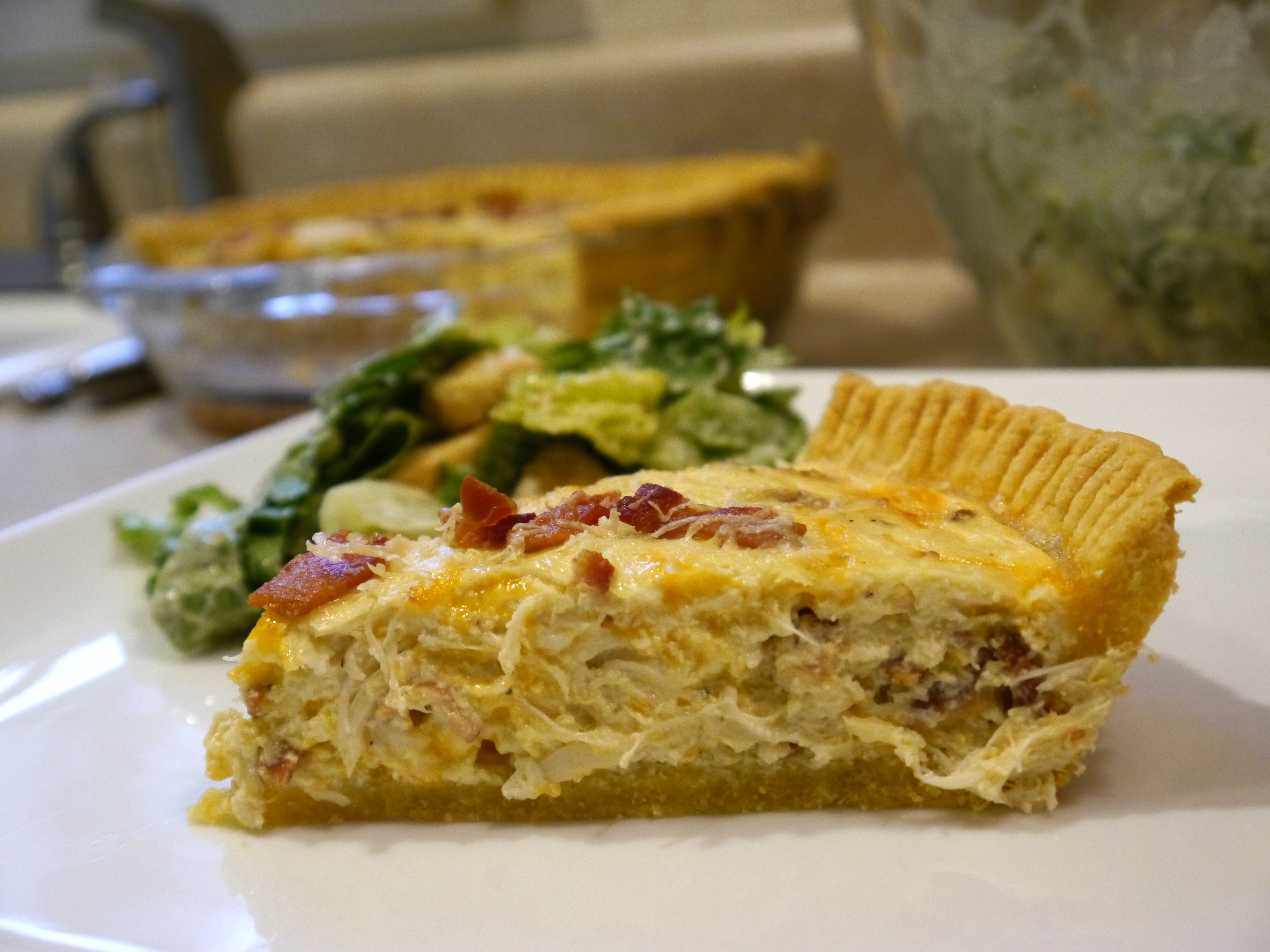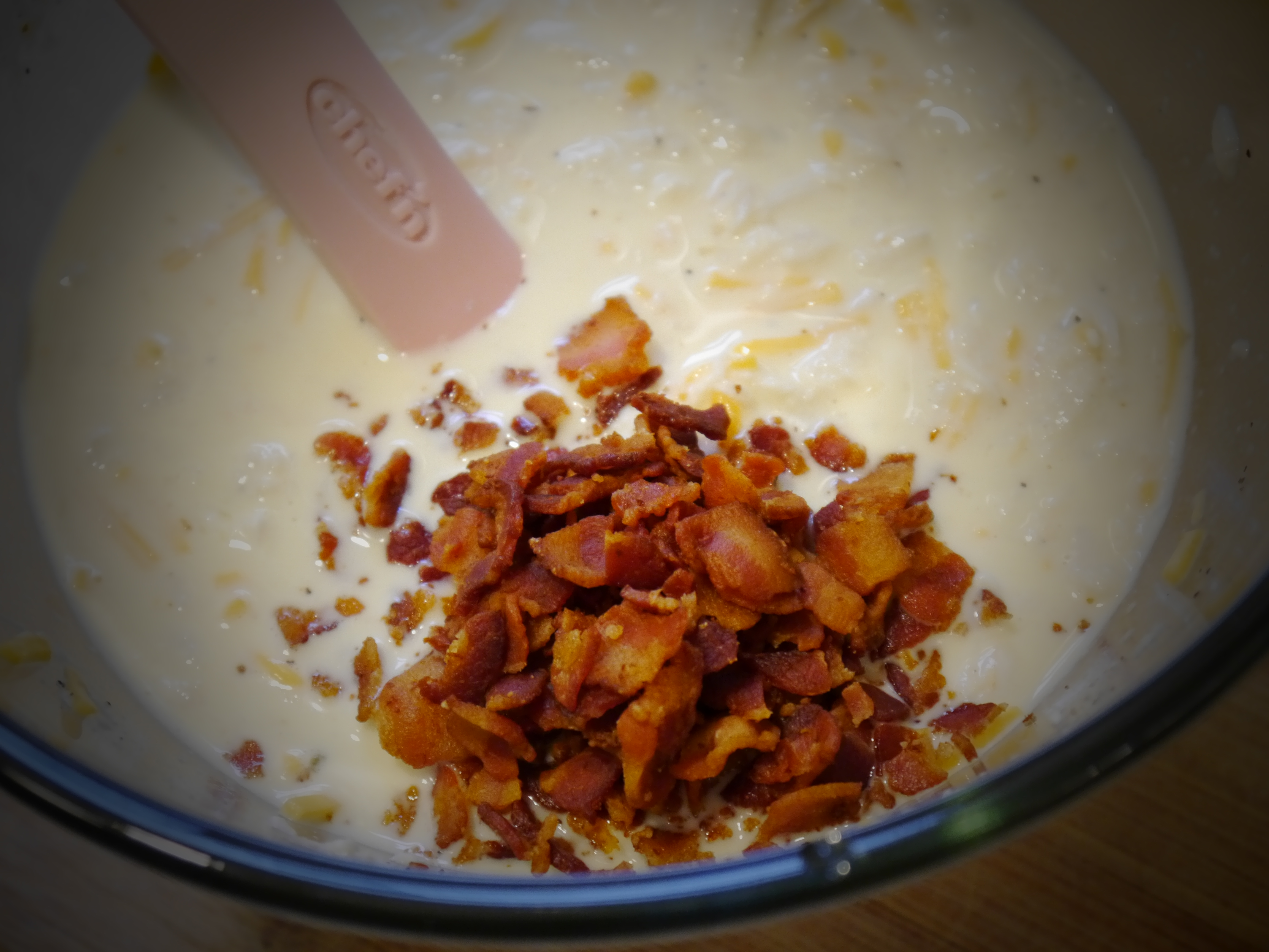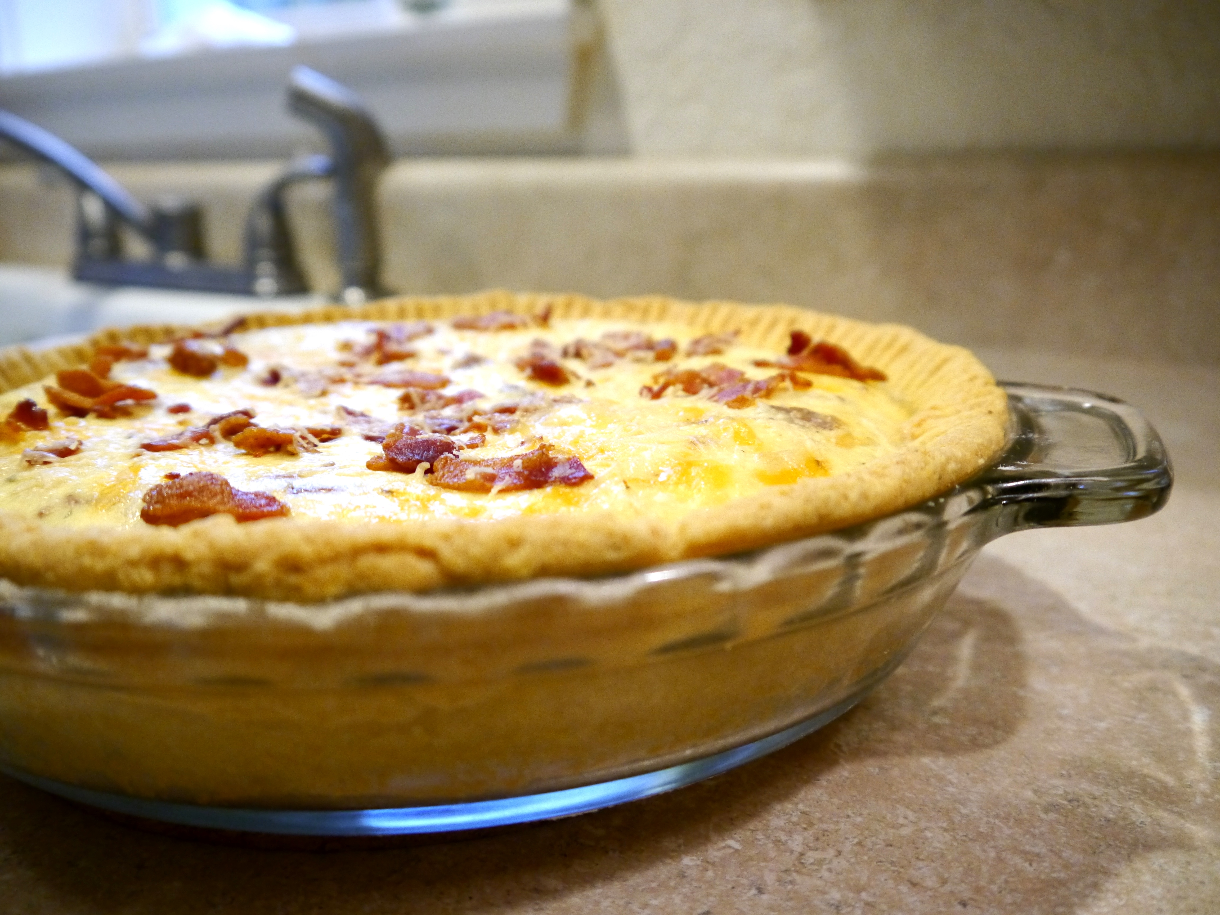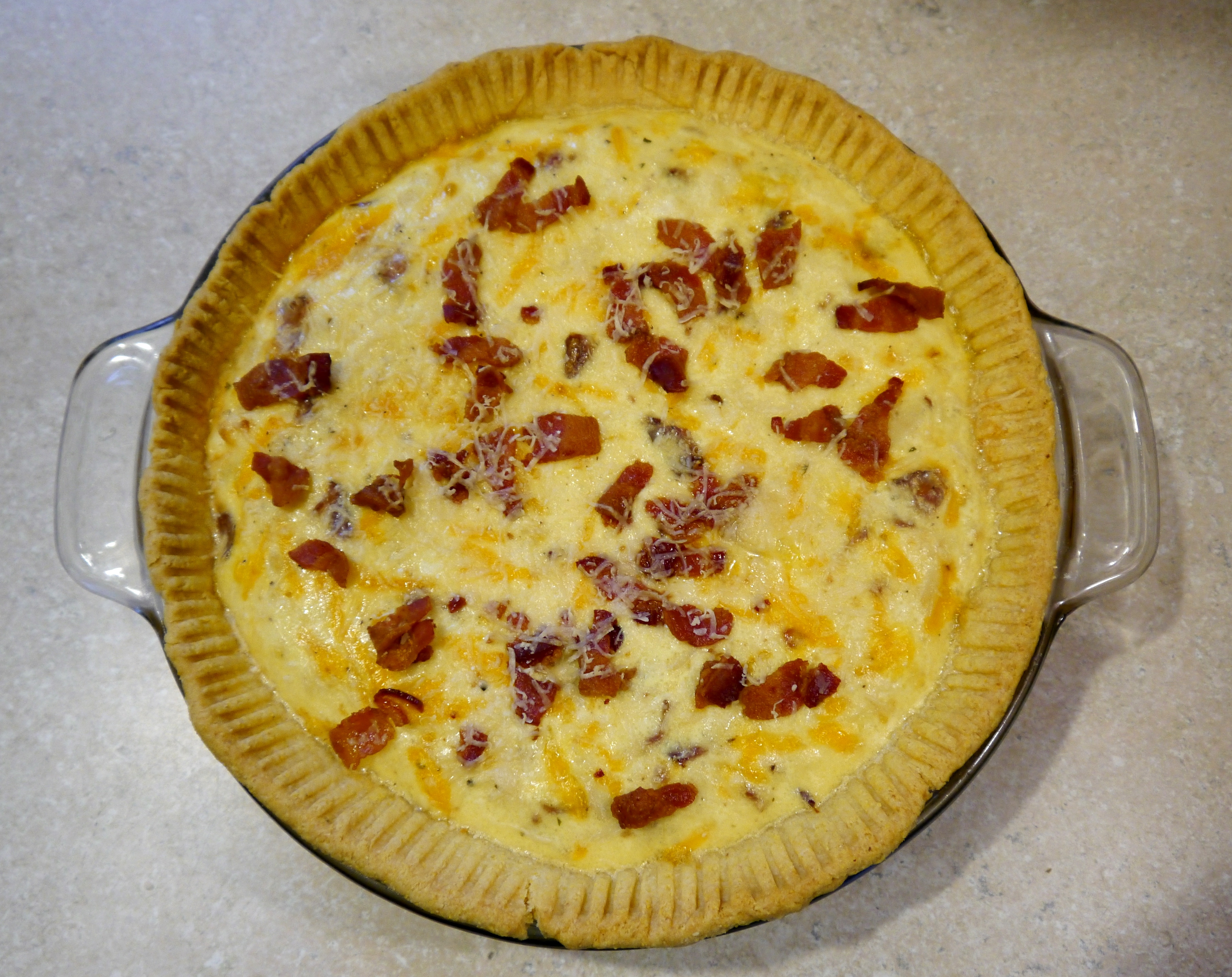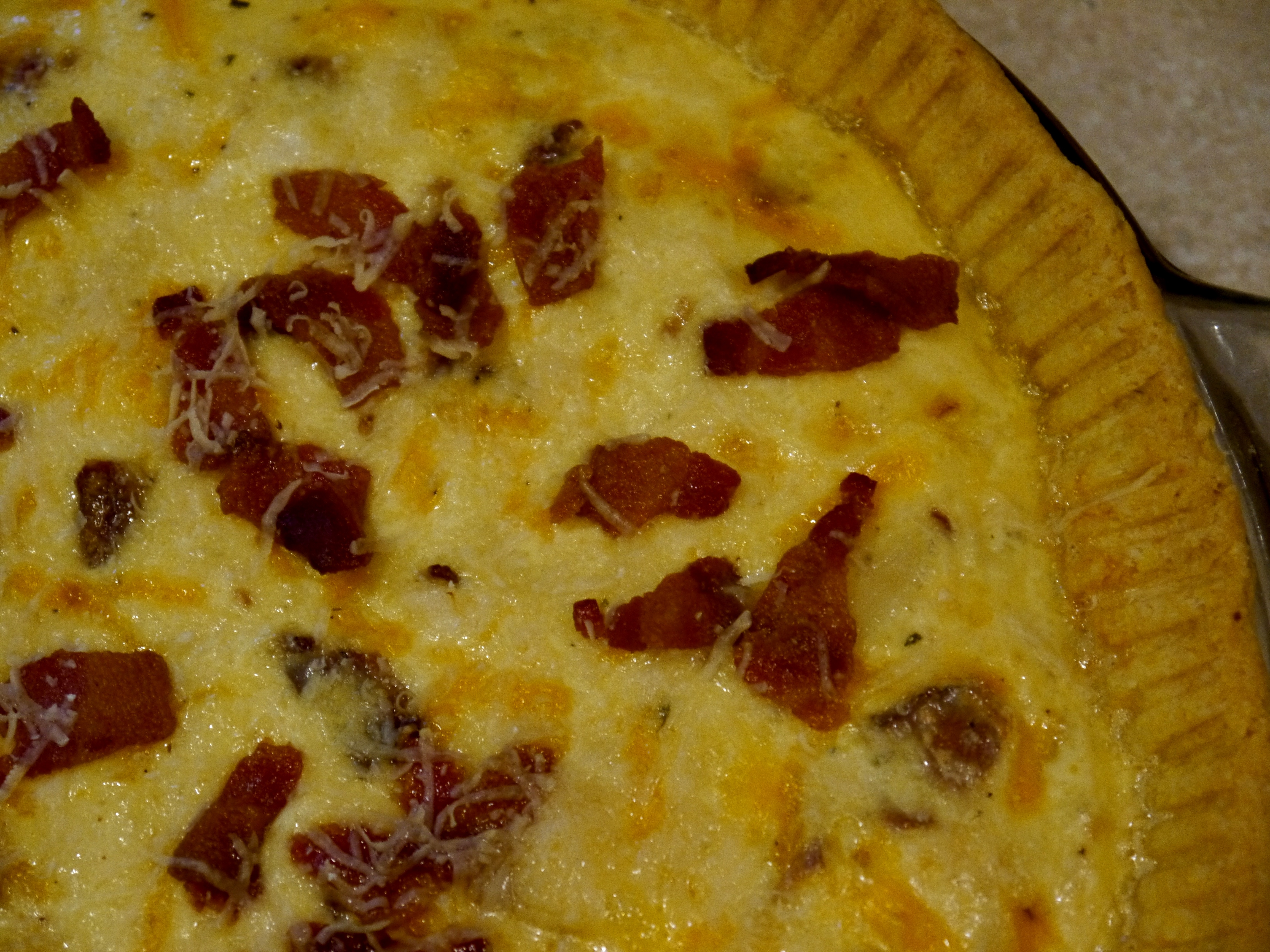 Bake at 350 degrees for around 45 minutes.  As soon as the center is set (not wiggly) and it’s brown and bubbly, it’s done.  I sprinkled a little extra bacon and shredded cheese on top halfway through cooking.  Let it sit for about 15 minutes before you slice it.  The possibilities are almost endless with this.  You can use cooked shrimp, cooked lobster, and any combination of cheeses!  Enjoy!!