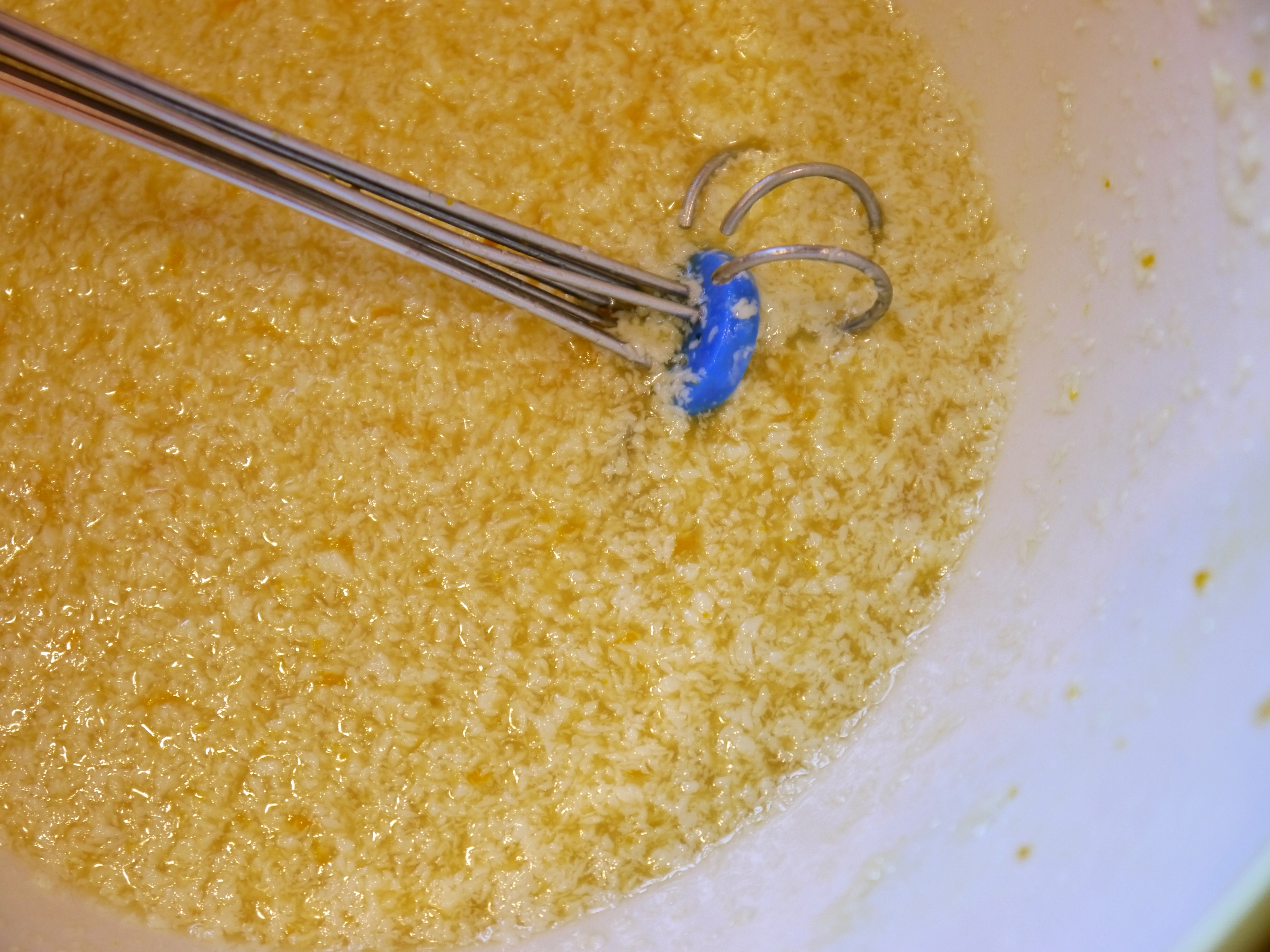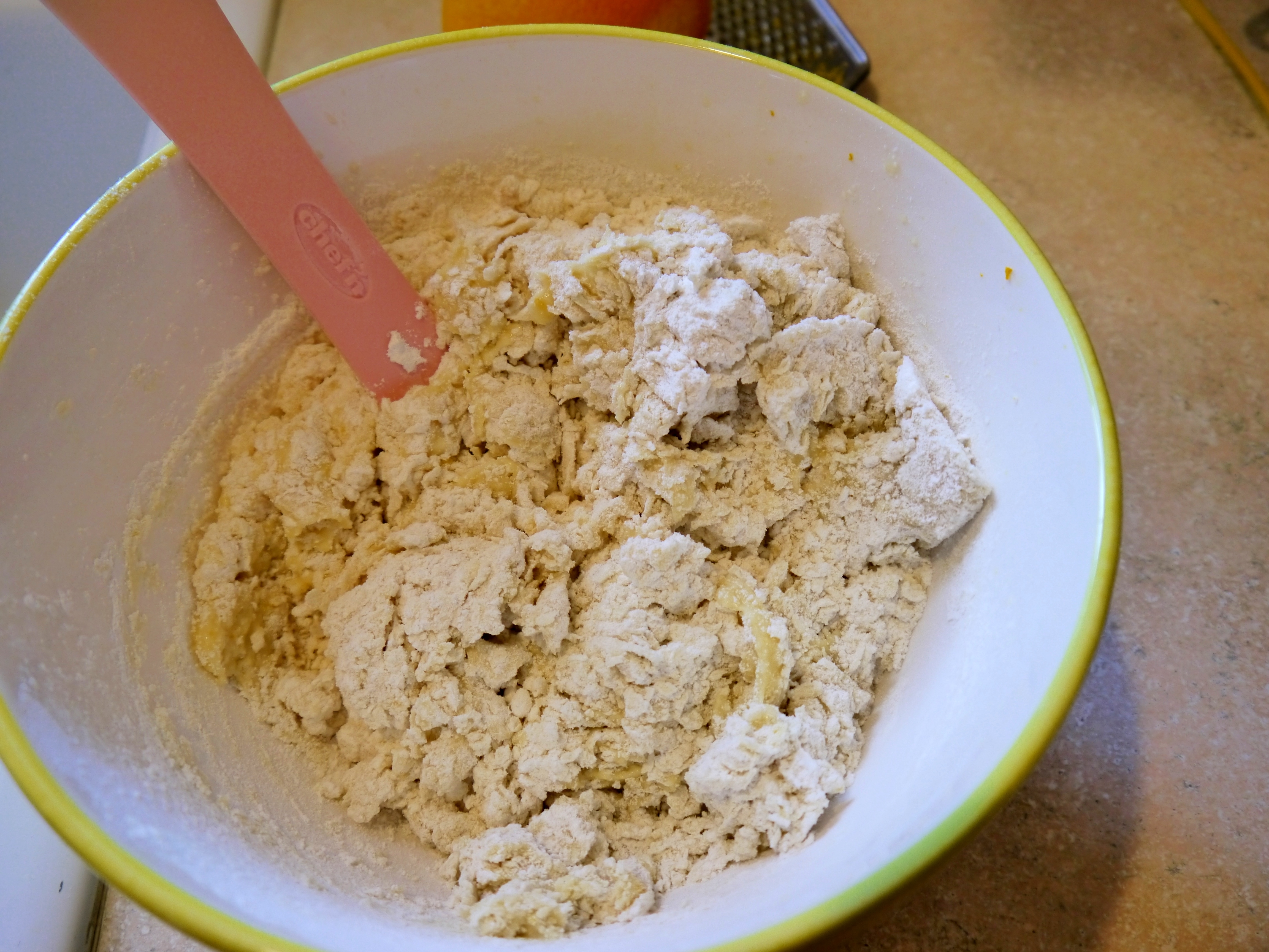 Whisk in the sugar, softened butter, the orange zest, and the egg. The butter is softened, not melted. You will see little bits of it in the mixture; it will not be smooth. That is good. Those little pockets of butter create the flakiness you want in the pastry.