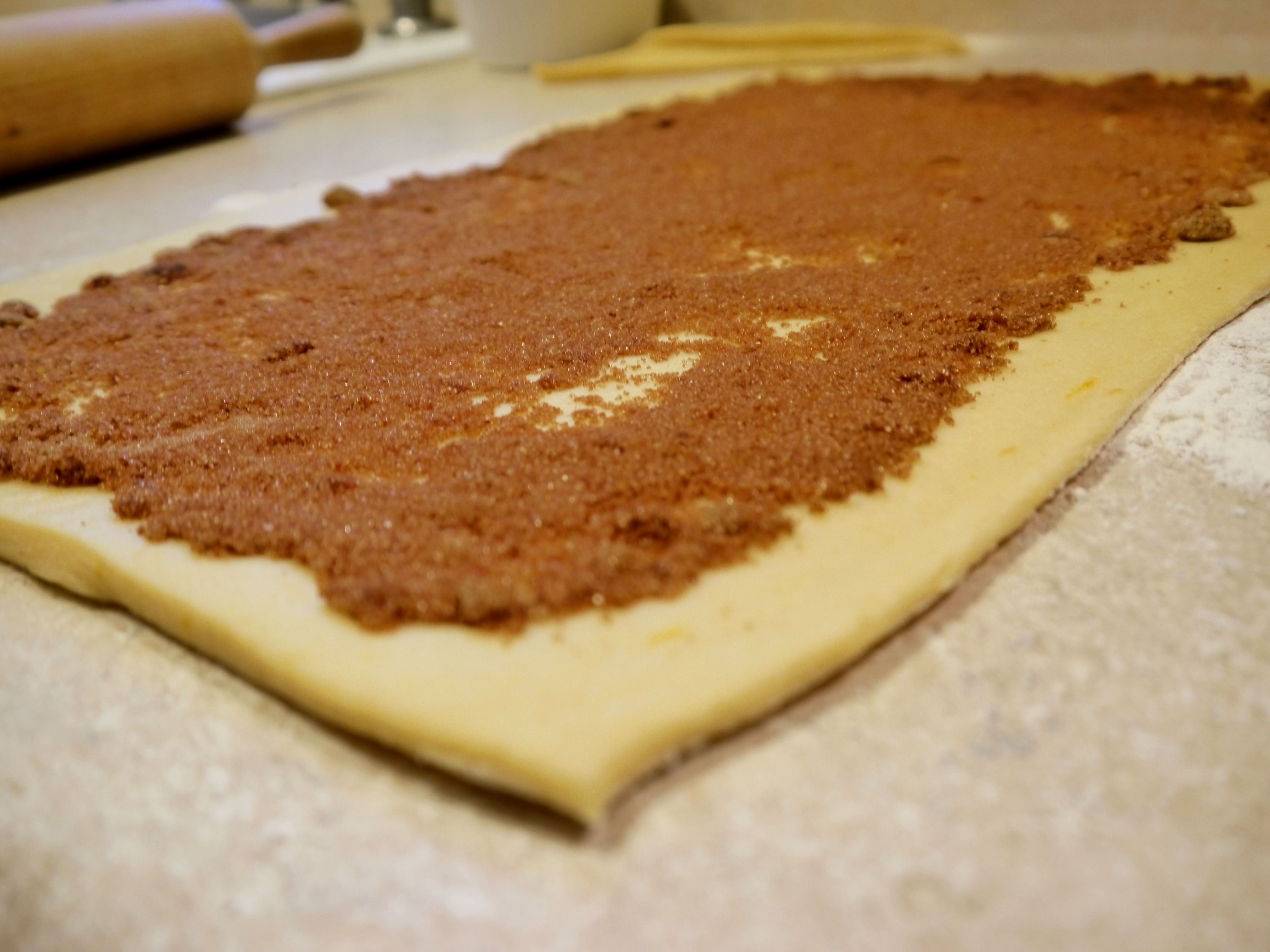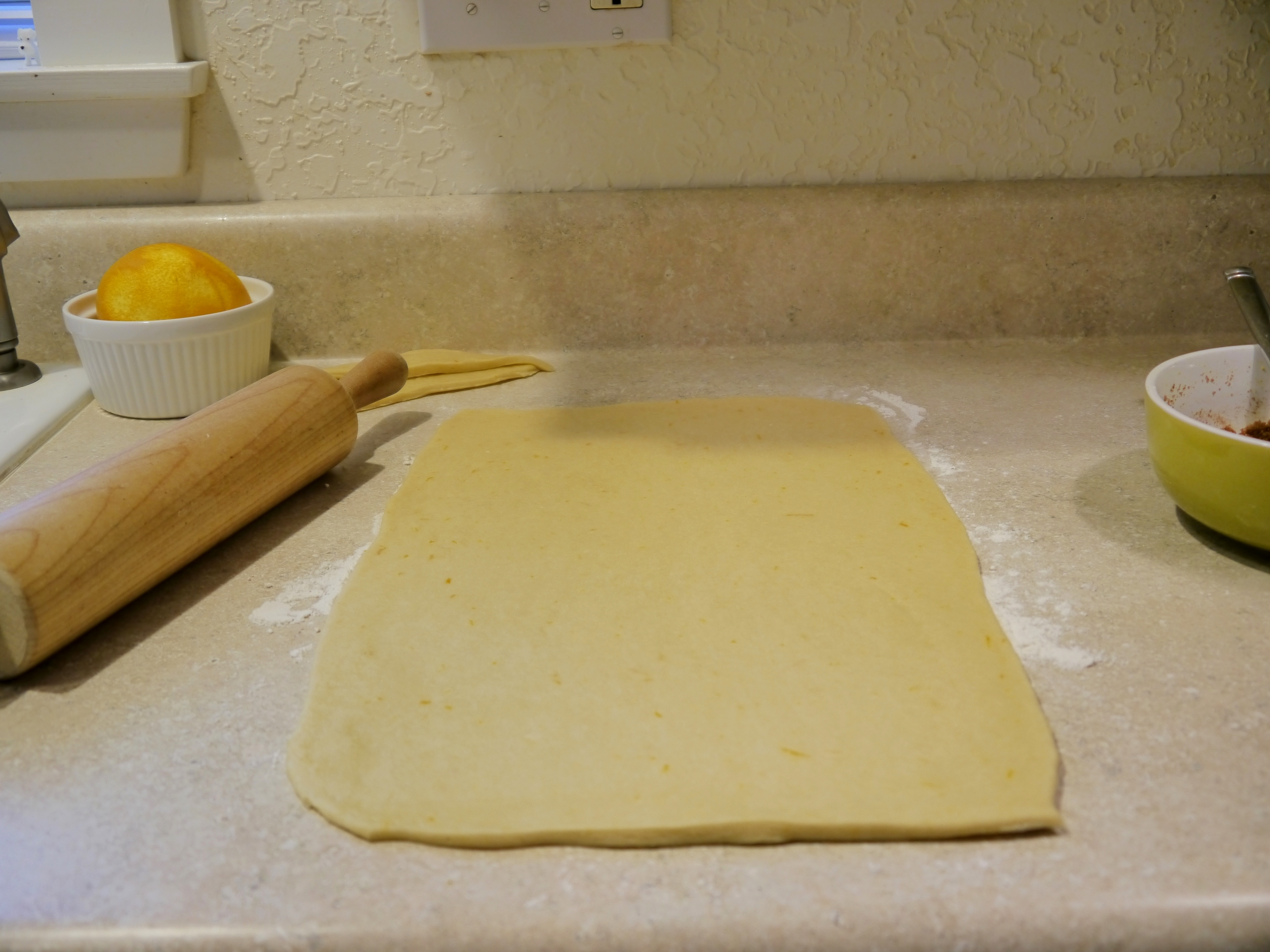 Roll it out into a rectangle. 10″ x 20″ is a good goal. I had to trim a little off the short ends of my rectangle to get it into a more “square” shape. Spread the filling over the dough, leaving a border of around 1/2″ on the long sides so you can get a good seal when you roll it up.