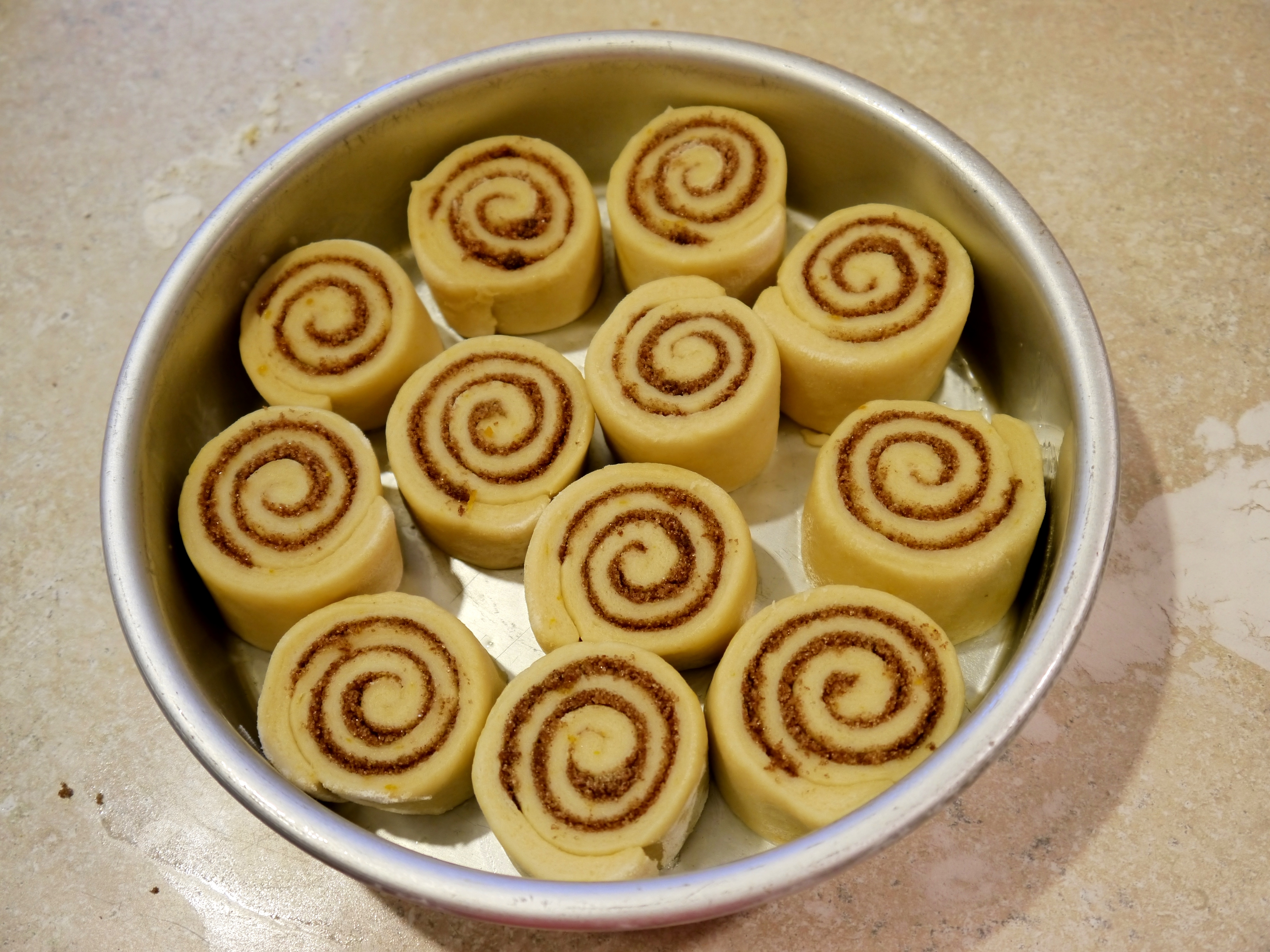 Put your slices into a greased round pan. (I used a 9″ pan here.) Leave some room around each one because you are going to let them rise again and they will get big this time! Cover the pan and let them rise for about 30 minutes or until they are all touching each other.