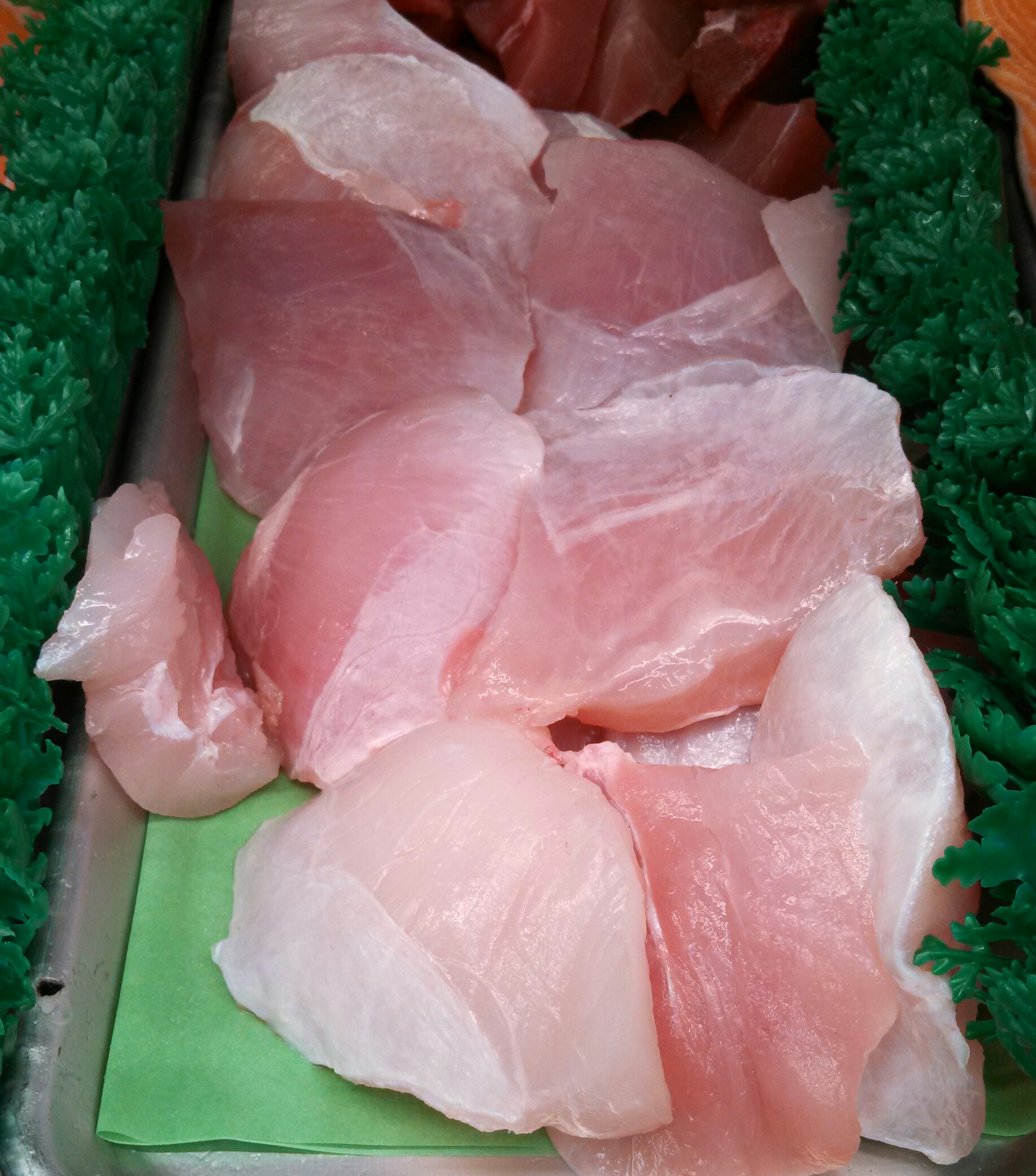 What is a Grouper Cheek? It comes from a Grouper. It actually comes from the area right between the mouth and the gill… the cheek, if fish really had “cheeks”. It’s a tender little medallion of deliciousness. Because this is considered a “byproduct” of processing fish, the price is great despite the excellent quality. For example, the Grouper Cheeks at Cod & Capers are cut from the same fish that the gorgeous fillets are cut from. The Grouper Cheeks are $7.95/lb and the fillet is $23.95/lb. You can see the value here, right? It’s not for everyone but it’s worth a try. At the shop, we have a limited number of these available for purchase each day. By the time I had this grand idea, they were nearly sold out. I settled for a piece of Grouper fillet instead. No big deal. It’s interchangeable in most recipes.