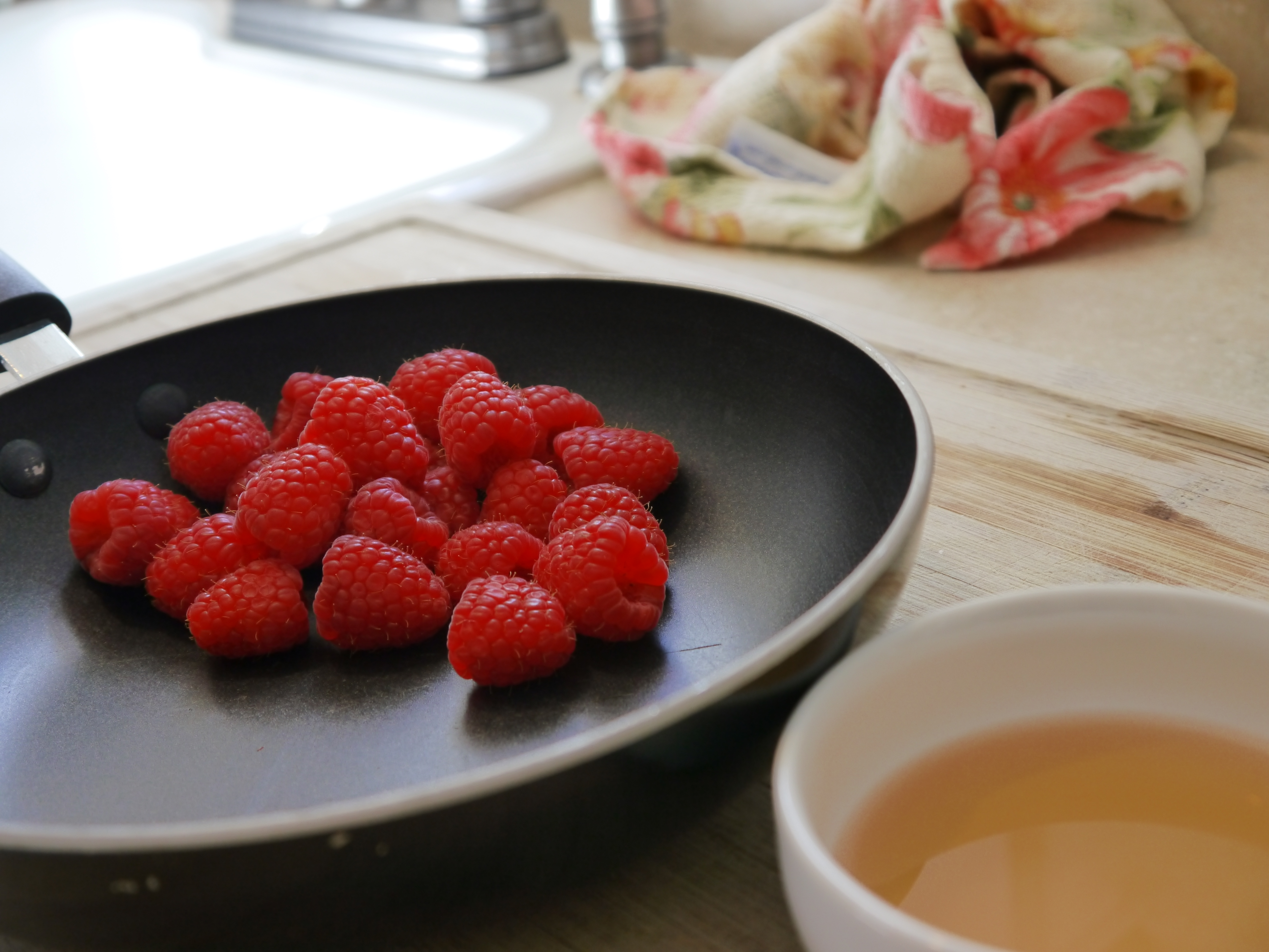 I was a little unsure of where to start with the sauce. I knew I liked the one I had before, but thought a little heat might be a nice addition. I started with one small container of raspberries and 2 tablespoons of Red Wine Vinegar. I put them in a small pan over medium heat until the berries were soft. I smashed them against the side of the pan with a spatula until they were fairly smooth.