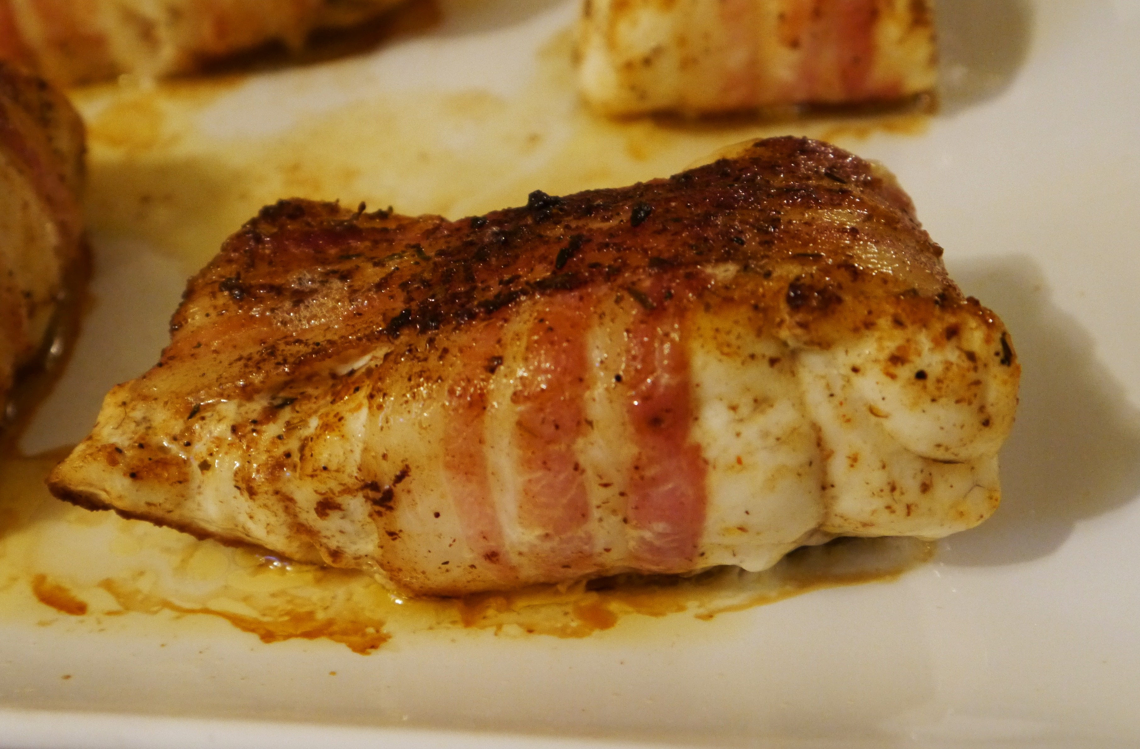 I started with a pound of Grouper fillet. I cut it into four equal pieces and got ready to wrap it in bacon.