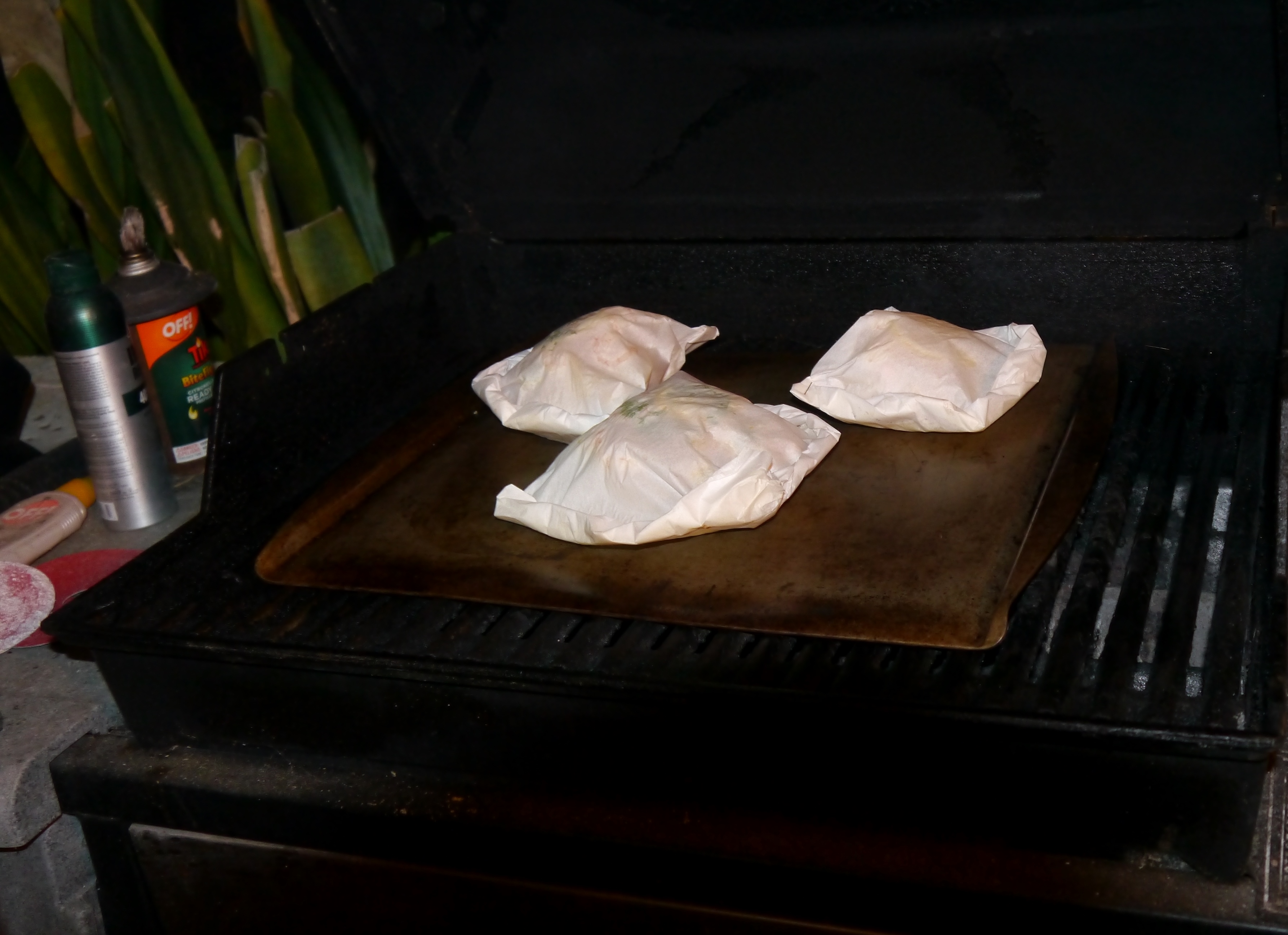 Back to the fish. I got out the biggest skillet I have (you need LOTS of room around the pieces of fish or they will just steam and your bacon will never get crispy). I heated it over medium-high heat and did not use any oil or cooking spray since, after all, we are dealing with bacon here. I put each piece of fish into the skillet with the bacon seams facing down. You want to seal those seams right away. I let them cook for about three minutes on this side and then carefully flipped them over and repeated the process.
