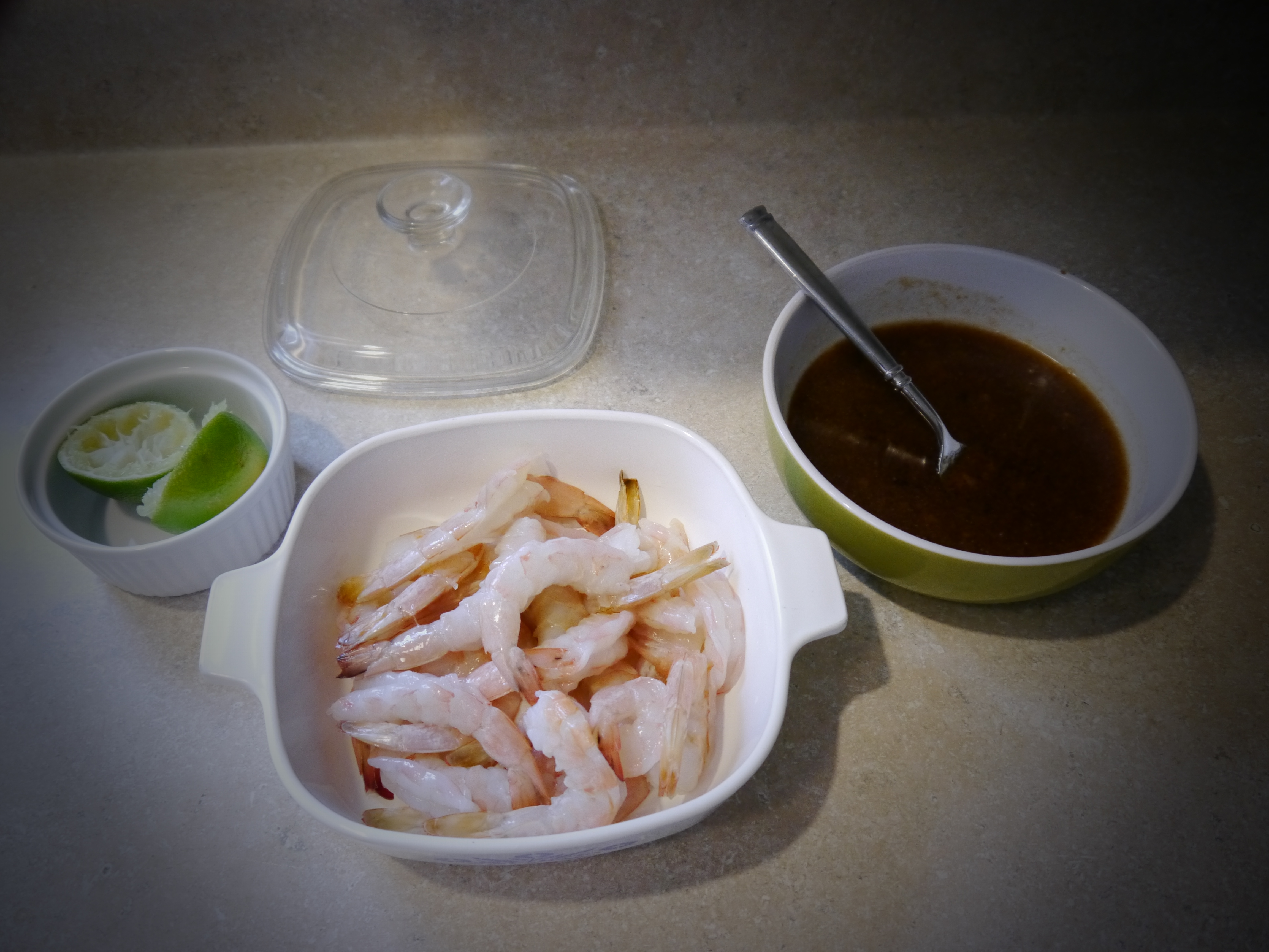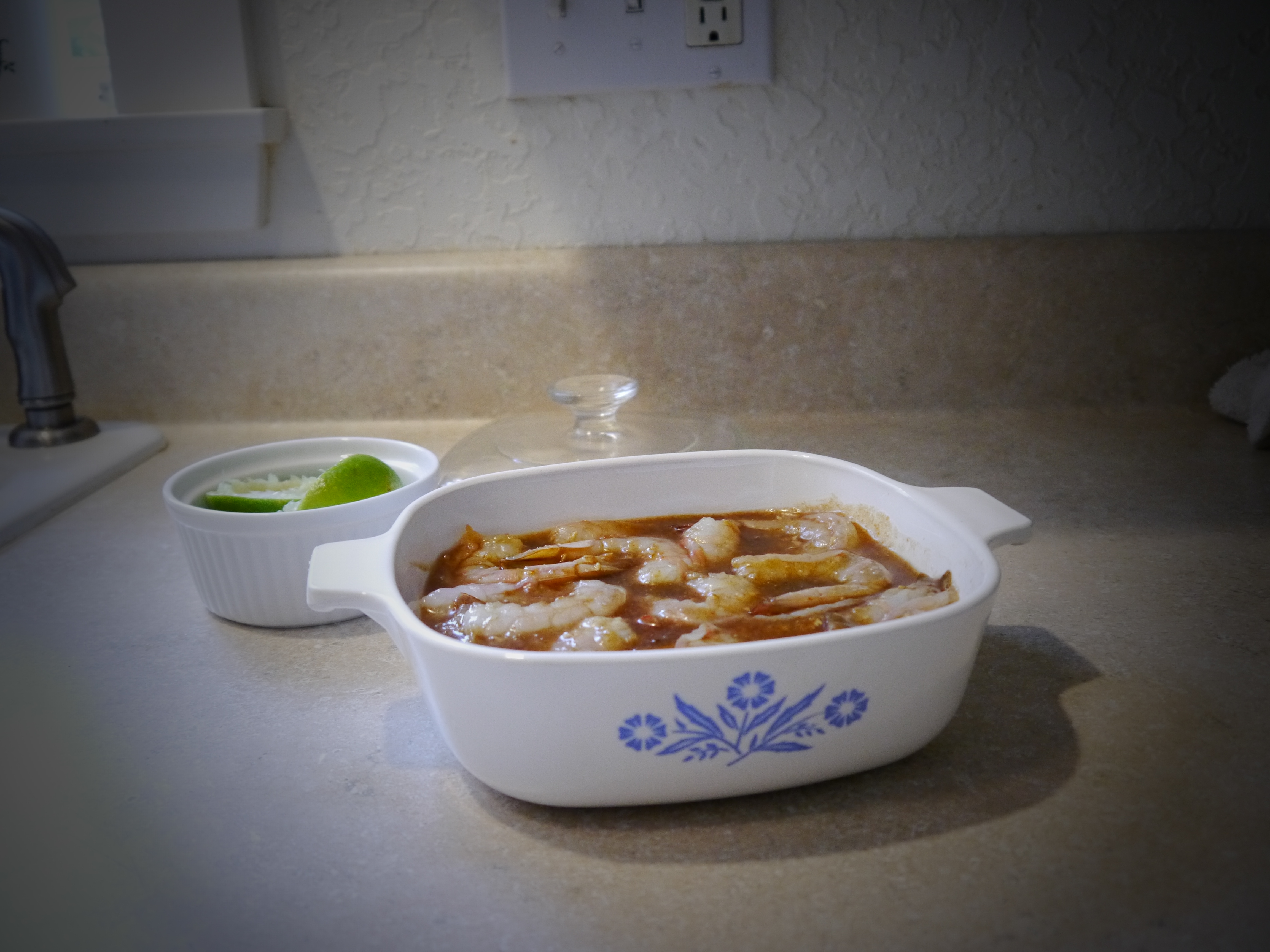 Pour the marinade over the cleaned shrimp. Cover and allow this to rest in the refrigerator for at least an hour. You could leave this for up to four hours, but if you leave it too long the citrus will start to break down the shrimp. I think an hour or two is plenty.