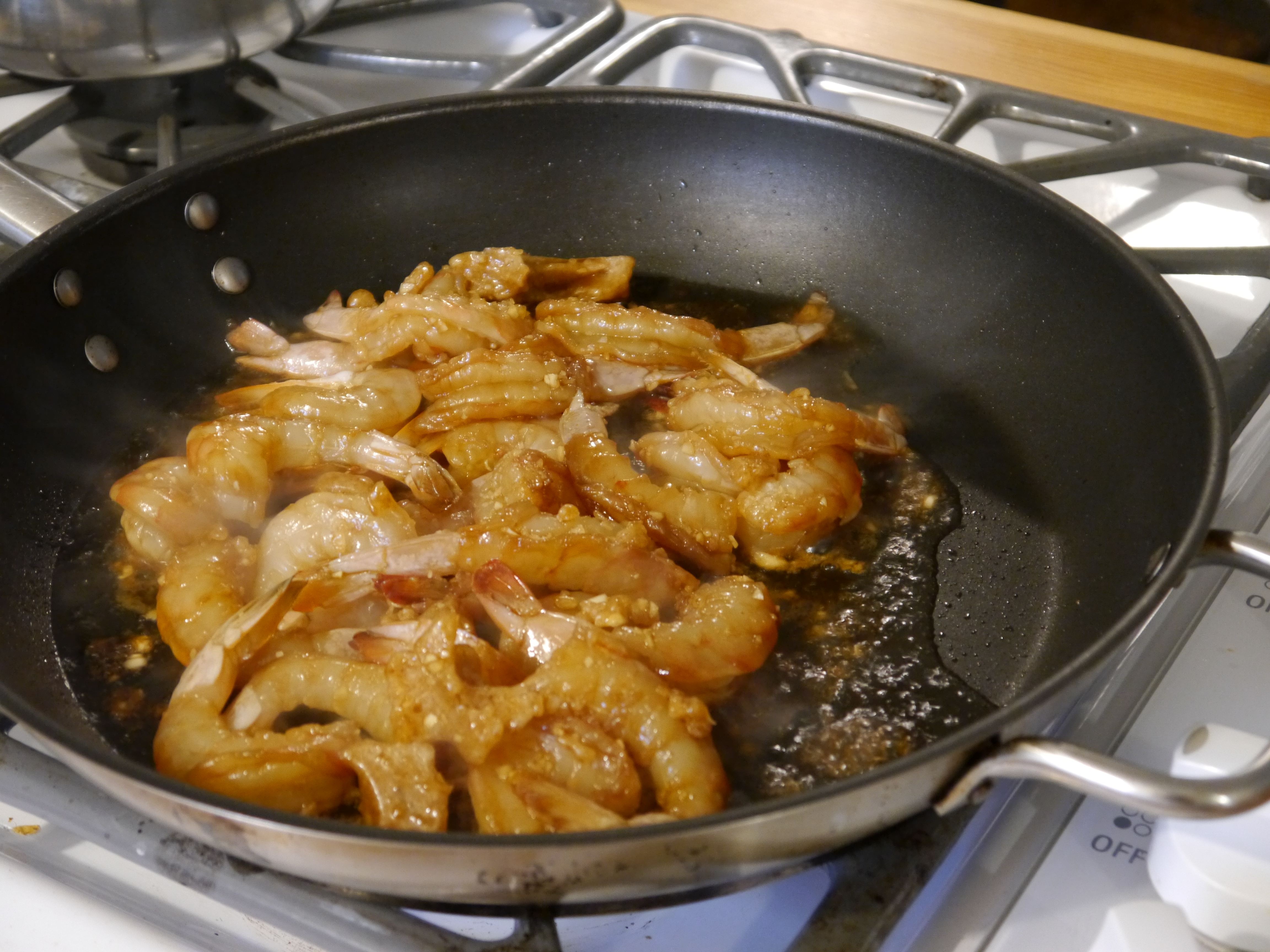 Back to the shrimp. There are two ways to do this. You can either skewer them and put them on the grill (I suppose you could also use a grill basket, if you have one) OR you can cook them in a large pan on the stove.