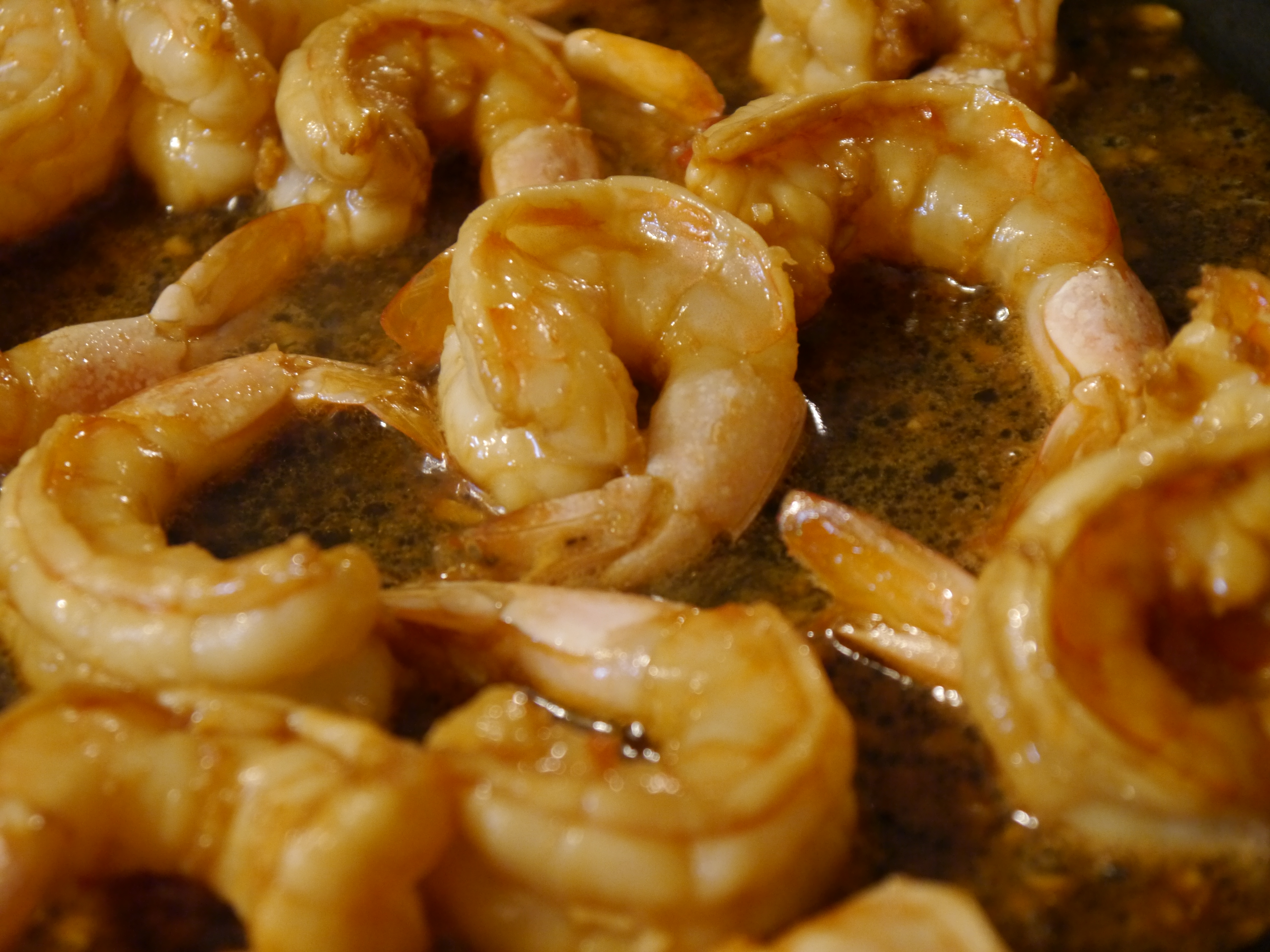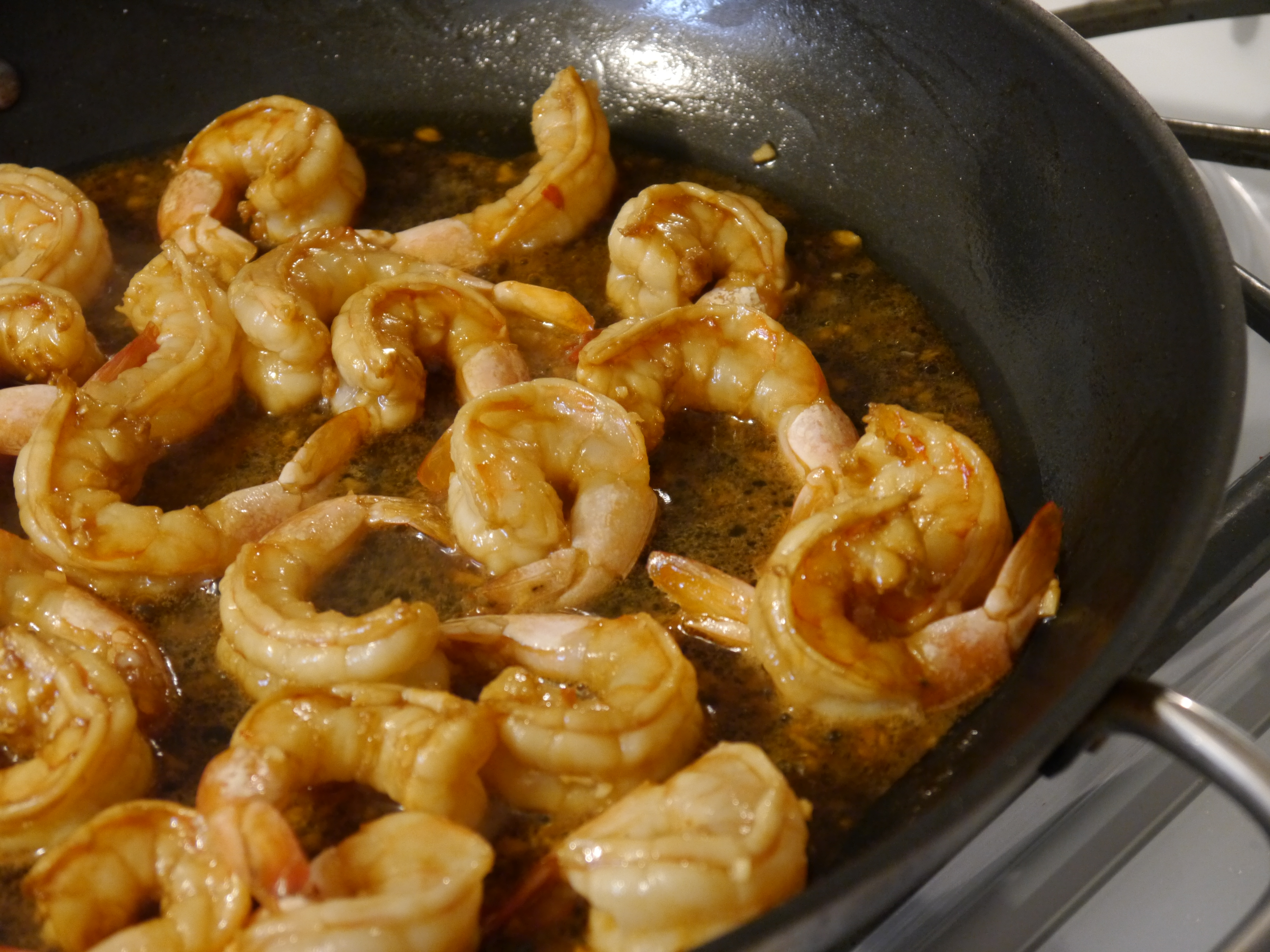 I was going for the quickest method here, so we cooked ours inside. Get the largest pan you have VERY hot. The shrimp are going to cook in no time and you want the sauce to bubble and thicken like a glaze. This is going to require high heat. Over high heat, put the shrimp directly into the pan. You don’t need any oil or cooking spray because there is coconut oil in the marinade already (by the way, the coconut oil has solidified in the fridge – that’s okay). I used a slotted spoon to put the shrimp in the pan. After all the shrimp were transferred, I added several additional spoonfuls of the marinade to the pan with them.